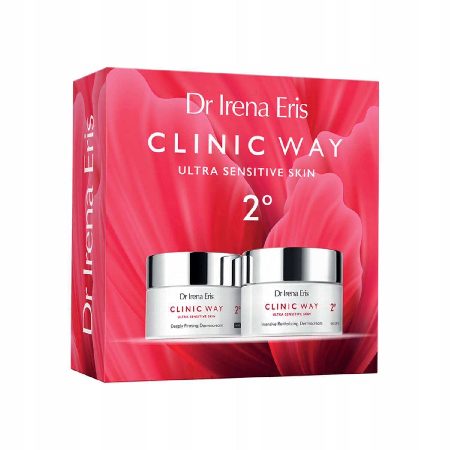 Dr Irena Eris CLINIC WAY 2° — ідеальний догляд за чутливою шкірою з втраченою еластичністю, зміною кольору та видимими першими стійкими зморшками. Зменшує зморшки, спричинені негативним впливом зовнішніх факторів, завдяки трьом активним інгредієнтам: запатентованій формулі FGF1 LMSTM з технологією дермального транспорту Lipo-Sphere, Retinoid і Aqua Calcis. Рекомендовано жінкам від 40 років. У набір входить: