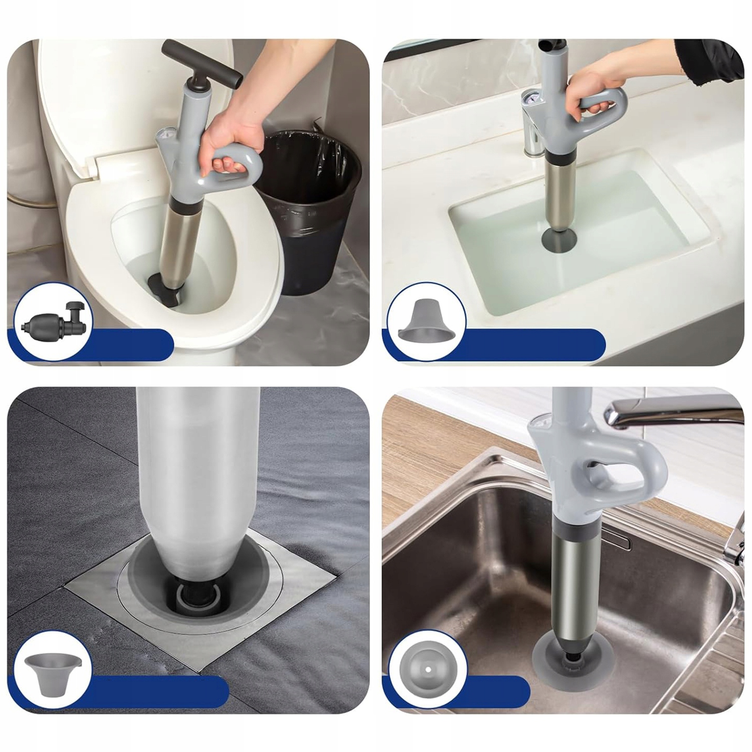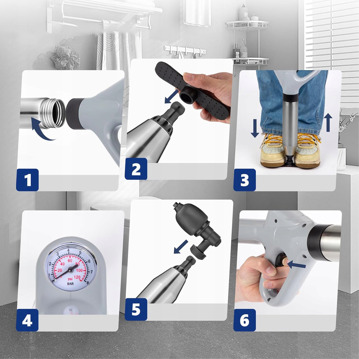 Інтегрована конструкція повітряного насоса та сталевої труби (міцна нержавіюча сталь) забезпечує прямий тиск на натовпи тиску. Простий у використанні, спочатку надувайте подушку безпеки, а потім вставте її в засмічений відтік і натисніть кнопку, щоб швидко усунути стійке засмічення каналізаційної системи. Підходить для всіх труб