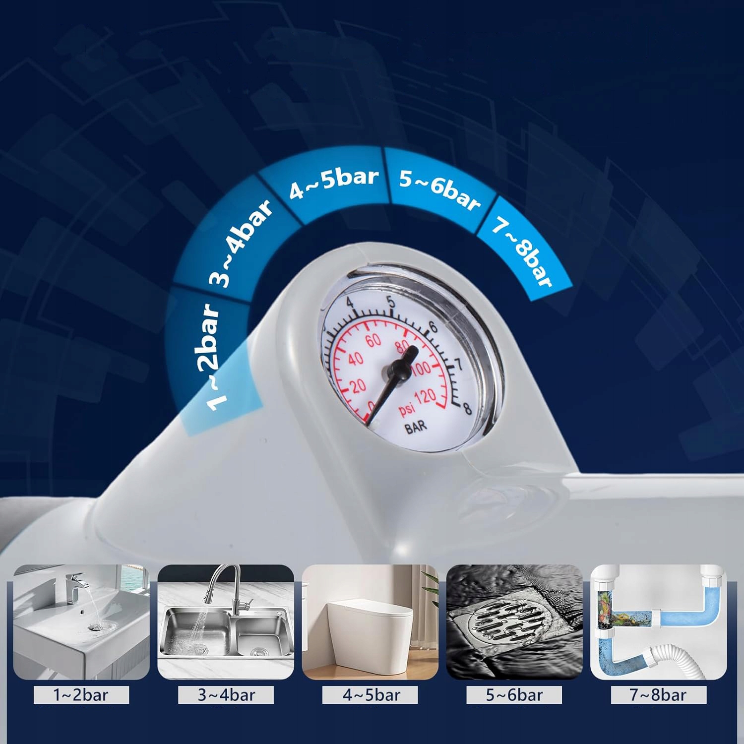 Завдяки манометрі тиску в режимі реального часу ви можете контролювати тиск. Відрегулюйте тиск, щоб задовольнити різні потреби. Рекомендуються 2-3 батончики для промитого 3-4 бару для стоків, 4-5 барів для стоків, 5-6 туалетних барів та 7-8 бар для високого тиску повітря