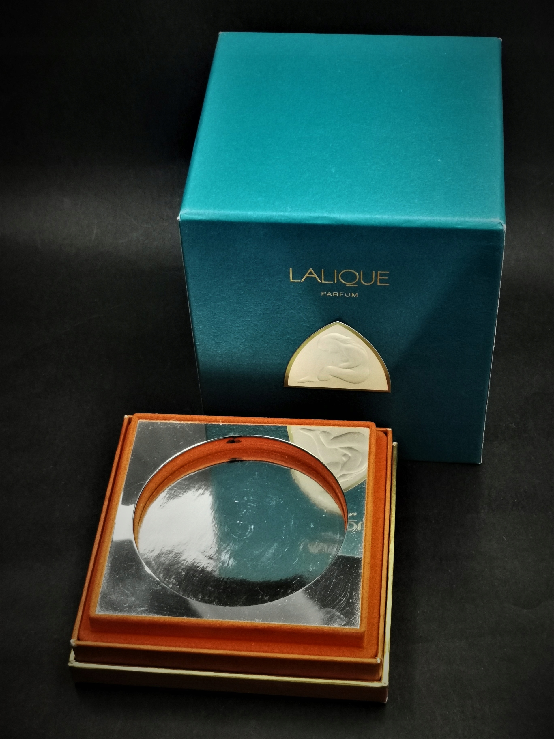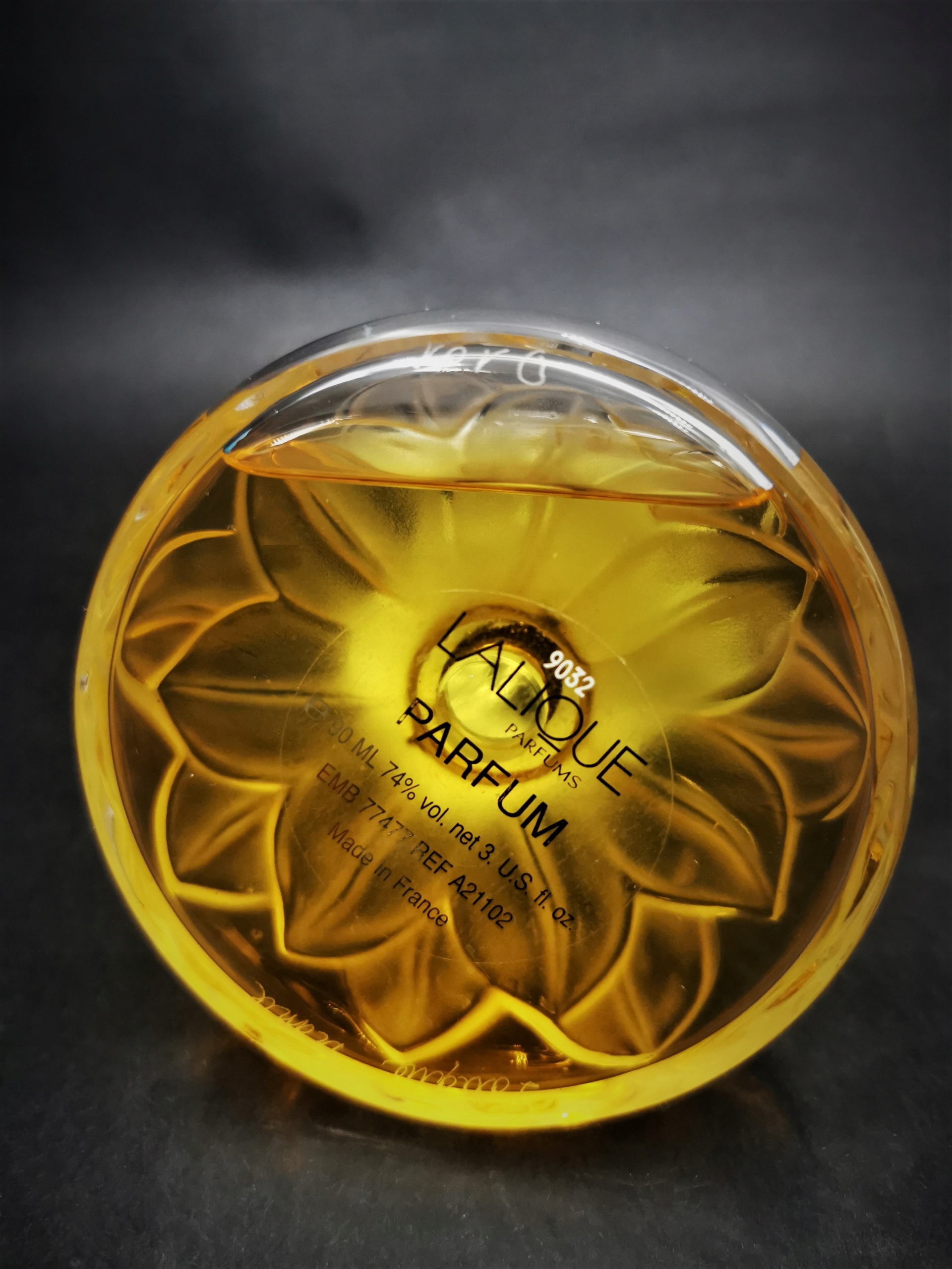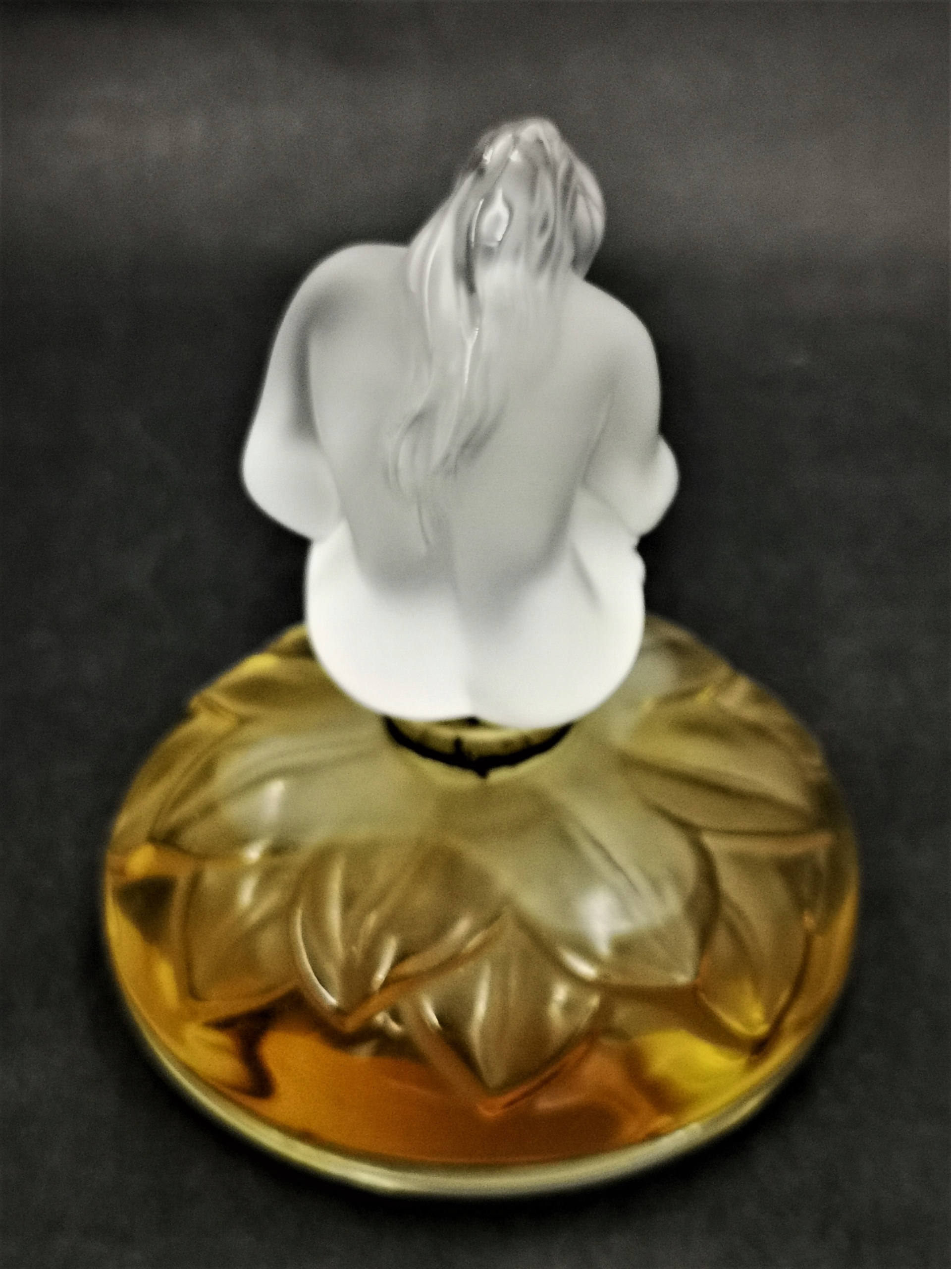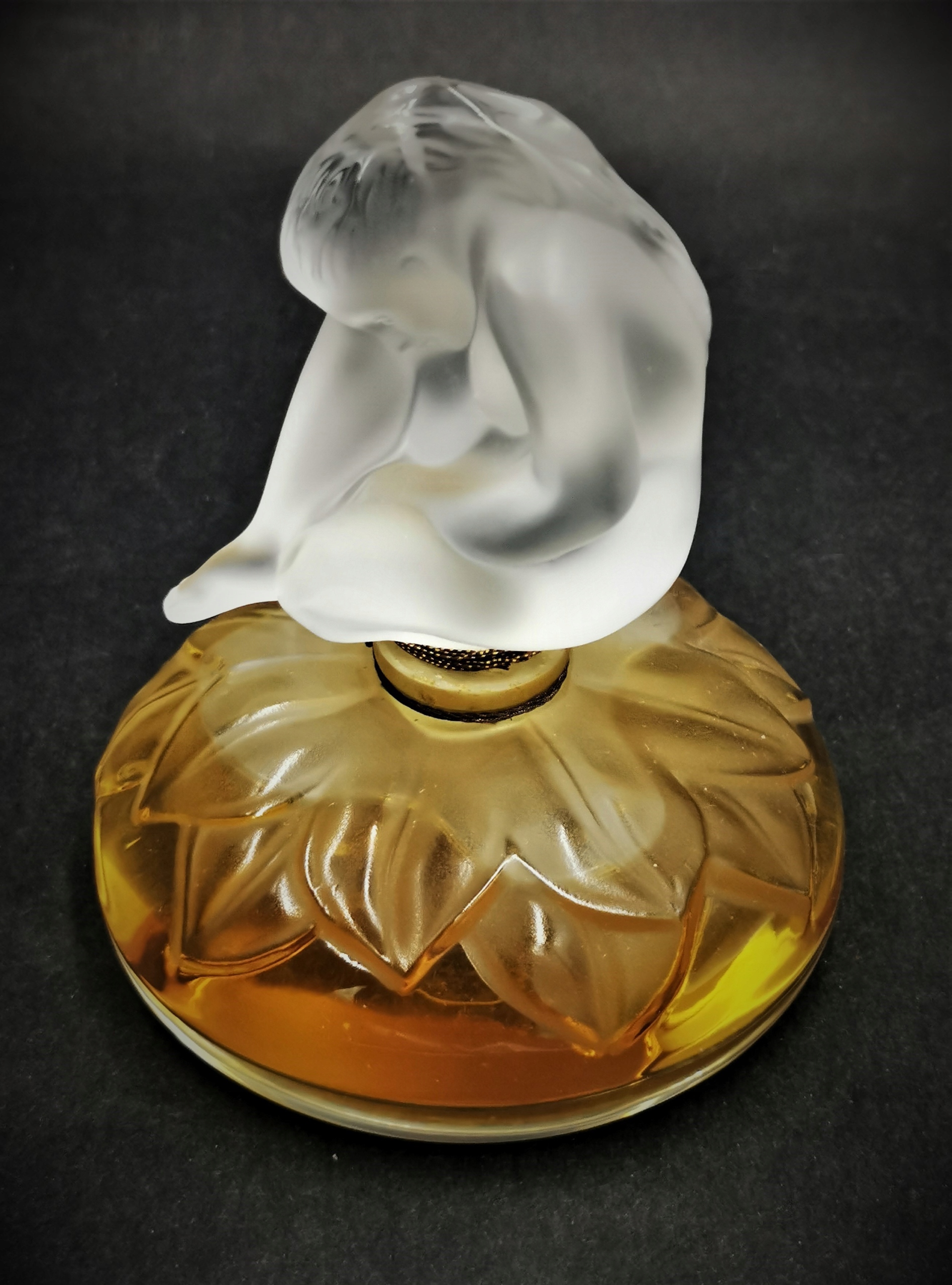 rene Lalique - французький творець скляних творів мистецтва, також називається скульптор світла. Спочатку- наприкінці 19 століття він мав справу з усім створенням ювелірних виробів. На початку 20 століття він почав працювати з Франсуа Коті, виробляючи оригінальні пляшки з парфумами. Пляшки зі скляними пляшками Lalique підкорювали ринок у всьому світі, часто натхненний грецькою міфологією та астрологією. Потім Lalique почала працювати з іншими виробниками парфумів і заснував власну фабрику скляного виробництва. Його продукція славиться своєю чарівністю, а деякі копії досягають навіть казкових сум. Представлена пляшка - це такий невеликий витвір мистецтва в стилі мистецтва. Безсумнівною перевагою пляшки є її чудова кришка кришки, виготовлена з кришталевого скла, представляючи фігуру оголеної жінки з довгим волоссям. Майстерність, його розкішний вимір характерний для творів Майстра Лаліка. Парфуми щільно спочатку закриті, пов'язані золотою ниткою. Парфумерне ставлення, підписане з назвою та прізвищем Творця (Рене Лаліка) та країною походження (Франція). Умову називають дуже хорошим як новим. Парфуми надходять з 1996 року і були упаковані в оригінальну бірюзову коробку. Розміри: