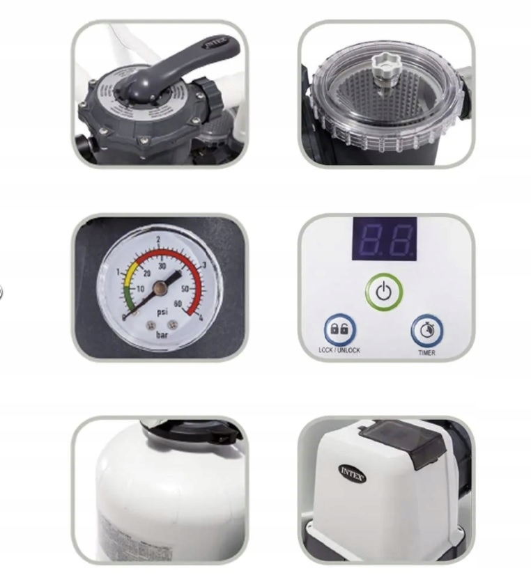фільтрація піску Krystal Clear Intex - це високоефективний та безпечний спосіб навколишнього середовища для підтримки чистої води в басейні. Це більш вигідне рішення, ніж традиційний фільтр -насос, оскільки для очищення води він використовує кремнеземний пісок замість паперового фільтра, тоді як традиційні вставки слід замінювати кожні 2 тижні, кремнеземний пісок достатньо протягом 3 років. Пісок ловить бруд та забруднення, а резервуар перед Filter фільтрує більші речі, забезпечуючи чисту воду протягом сезону.