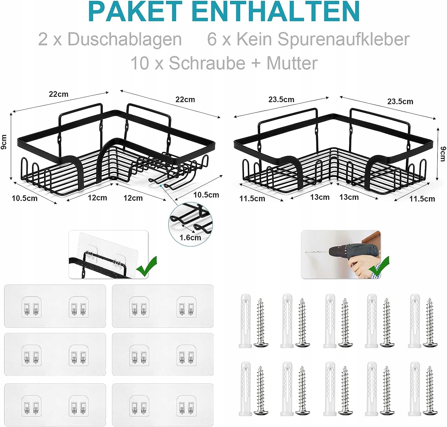 Полиця для душу Joqixon без свердління, нержавіюча сталь, чорний, кутова полиця для душу, 15 гачків, кошик для душу, кутова полиця з тримачем для бритви, тримач для мила, тримач для шампуню, 2 шт. h1>- 【Без свердління】: легко повісити без свердління, швидко та нескладно. Клей дуже міцний і тримається довго. Два додаткових клею також включені. Після встановлення душової полиці зачекайте 24 години, перш ніж використовувати її. Щоб зняти душову стійку, нагрійте її феном і відірвіть.