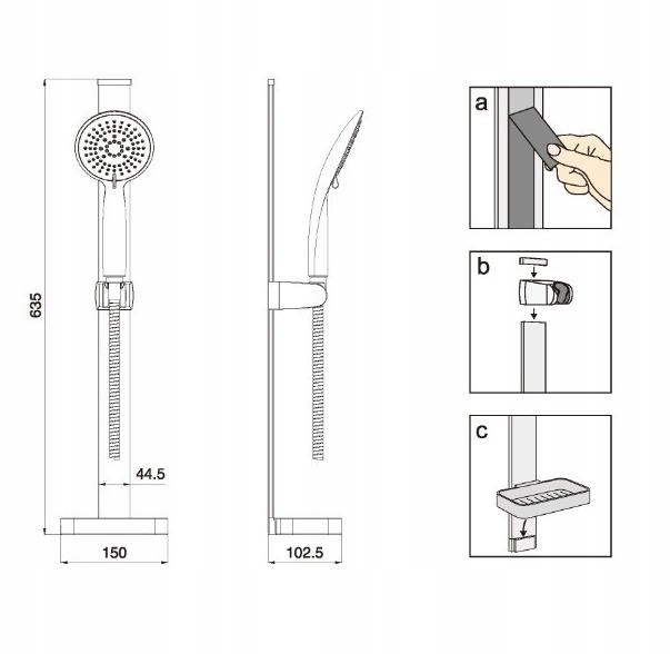 - набір складається з самоклеючої планки з полицею (мильницею), трифункціональної трубки та душового шланга з 1/2-дюймовим з’єднувачем, який підходить для всіх доступних змішувачів для душу та ванни на нашому ринку