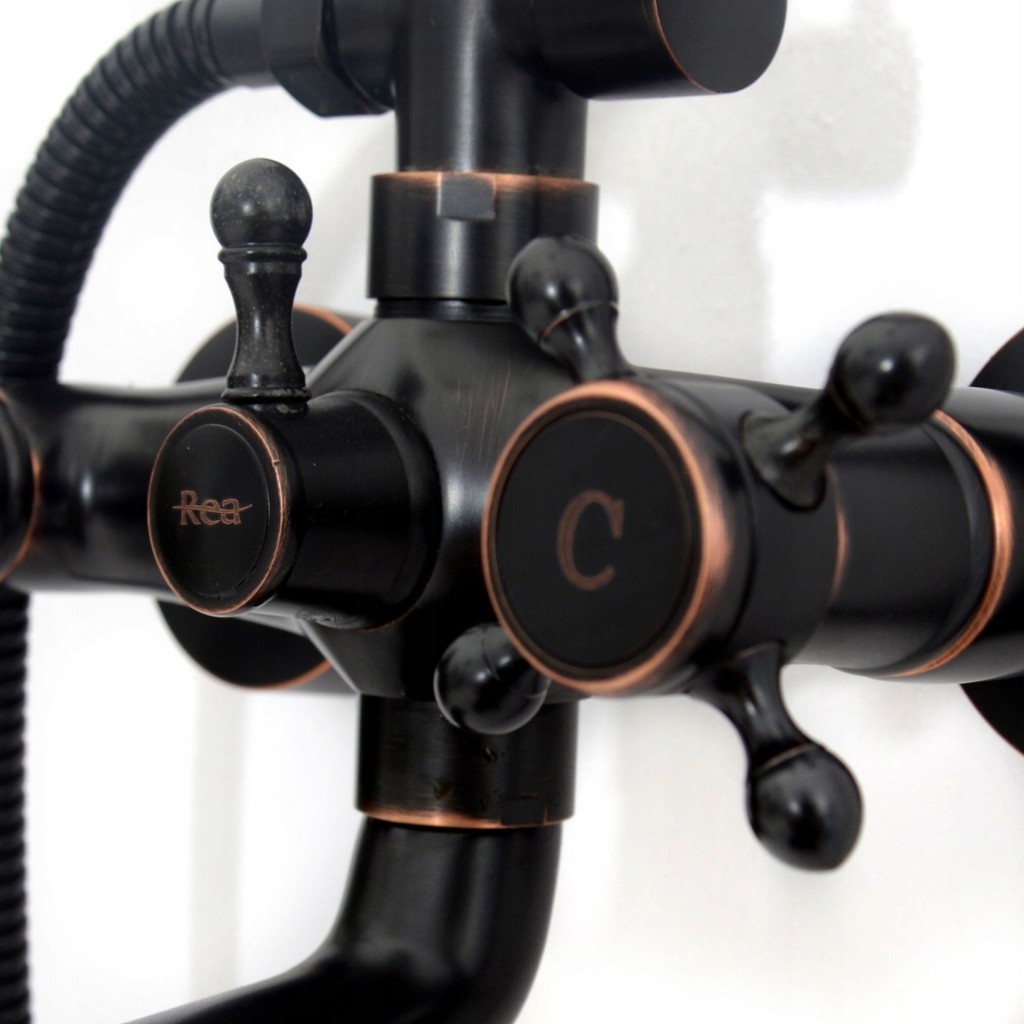 Душовий набір Rea Retro - це незвичайний душовий набір у стилі ретро. Матове чорне покриття з візуальними латунними елементами підкреслює унікальність цього комплекту та надає ванній кімнаті неординарний вигляд. Набір повністю виготовлений з латуні, оснащений тропічним душем 20,5 см, штукатурним краном і душовою лійкою зі шлангом 150 см. Відстань між батареями 150 мм.