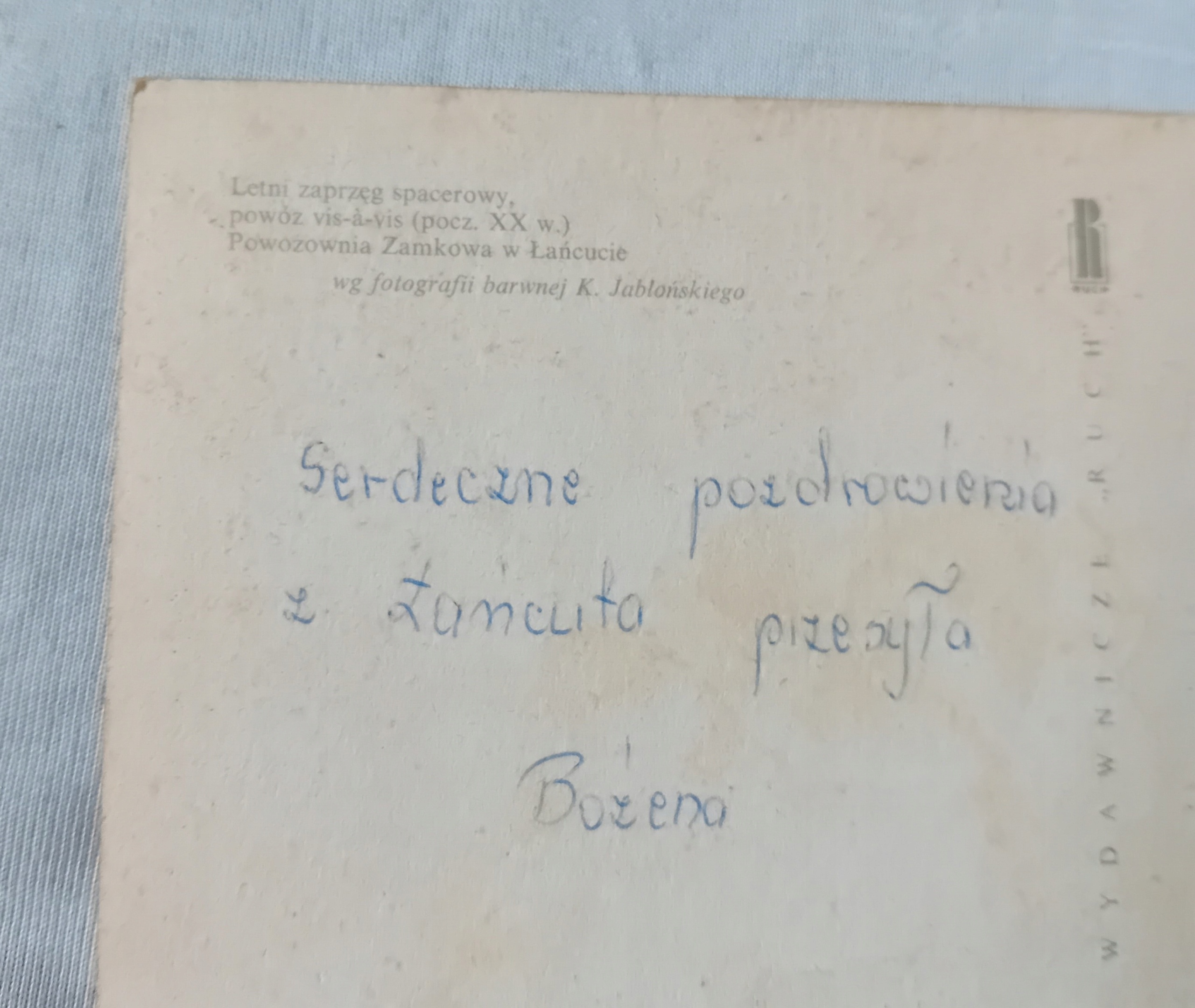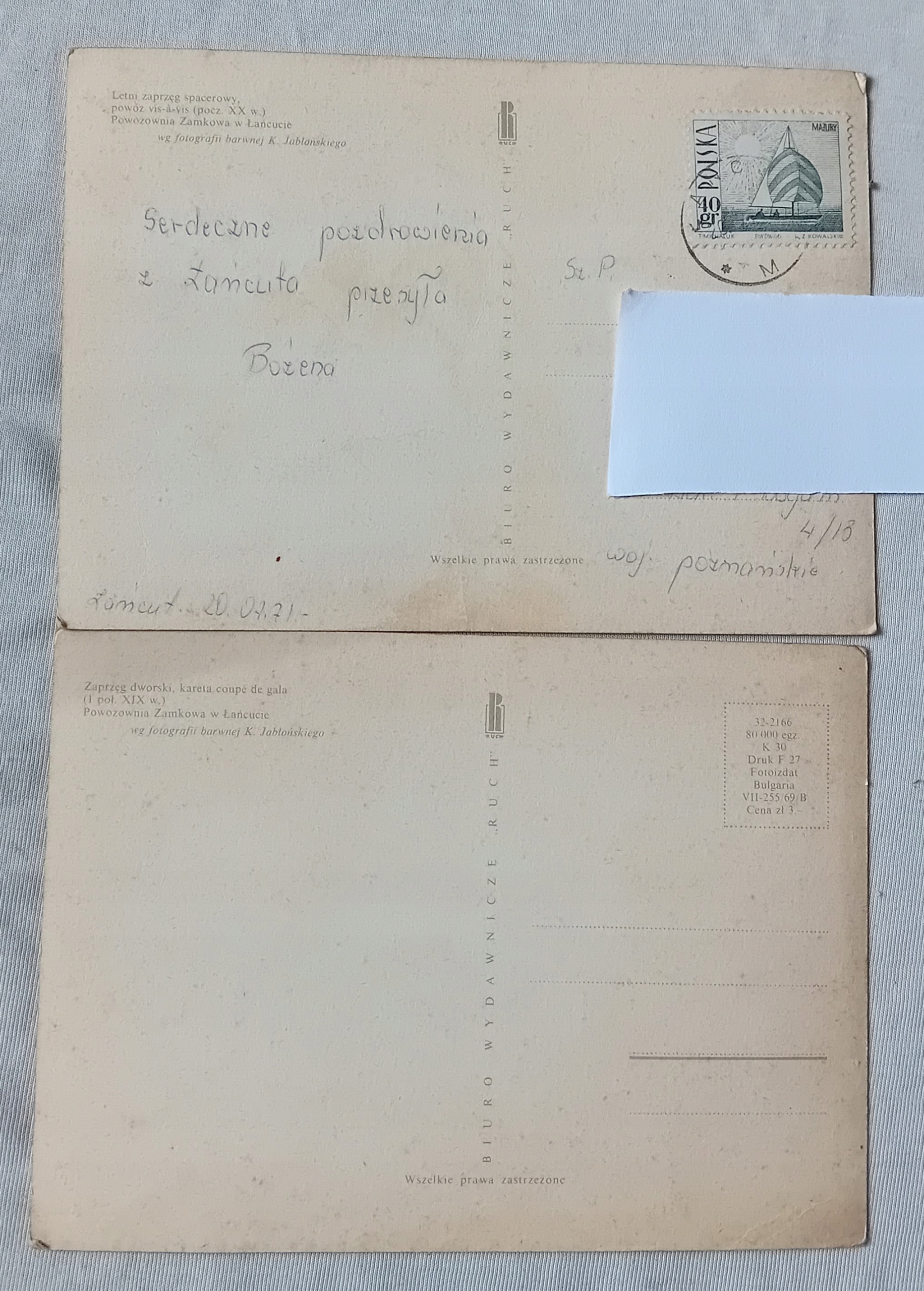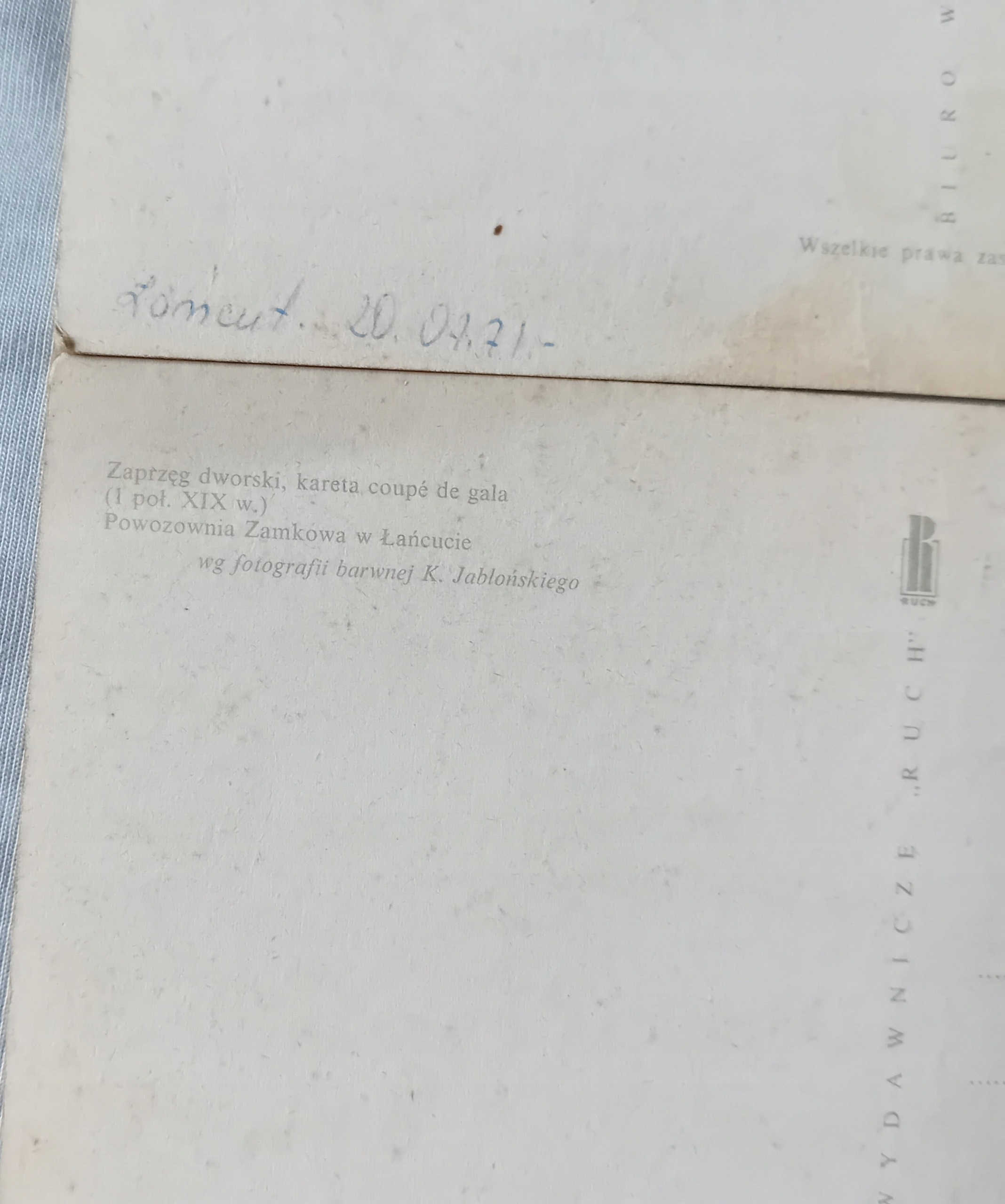 Продам дві листівки: Карета купе де гала, перша половина 19 століття та Карета vis-a-vis, початок 20 століття. Автор фото: K. Jabłoński. Видавець: Biuro Wydawnicze RUCH, 1969. Одна з листівок з тиражу, з маркою. Зі змісту листування видно, що воно надіслано у 1971 р. Стан середній. Кути загнуті, листівки брудні на звороті. Ціна вказана за 2 шт.