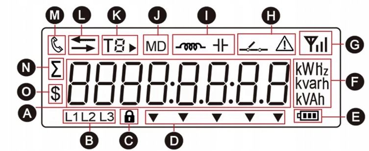 A: Вимірювання області відображення даних. заряд акумулятора. Складений тарифний індикатор вказує на діапазон тарифу, до якого належить струм електроенергії. Відображений номер тарифу представлений поточним діапазоном тарифів. Наприклад: T2 являє собою, що сегмент тарифу Т2 активний, а кумулятивна електроенергія буде включена у відповідну область тарифу Т2. дані.