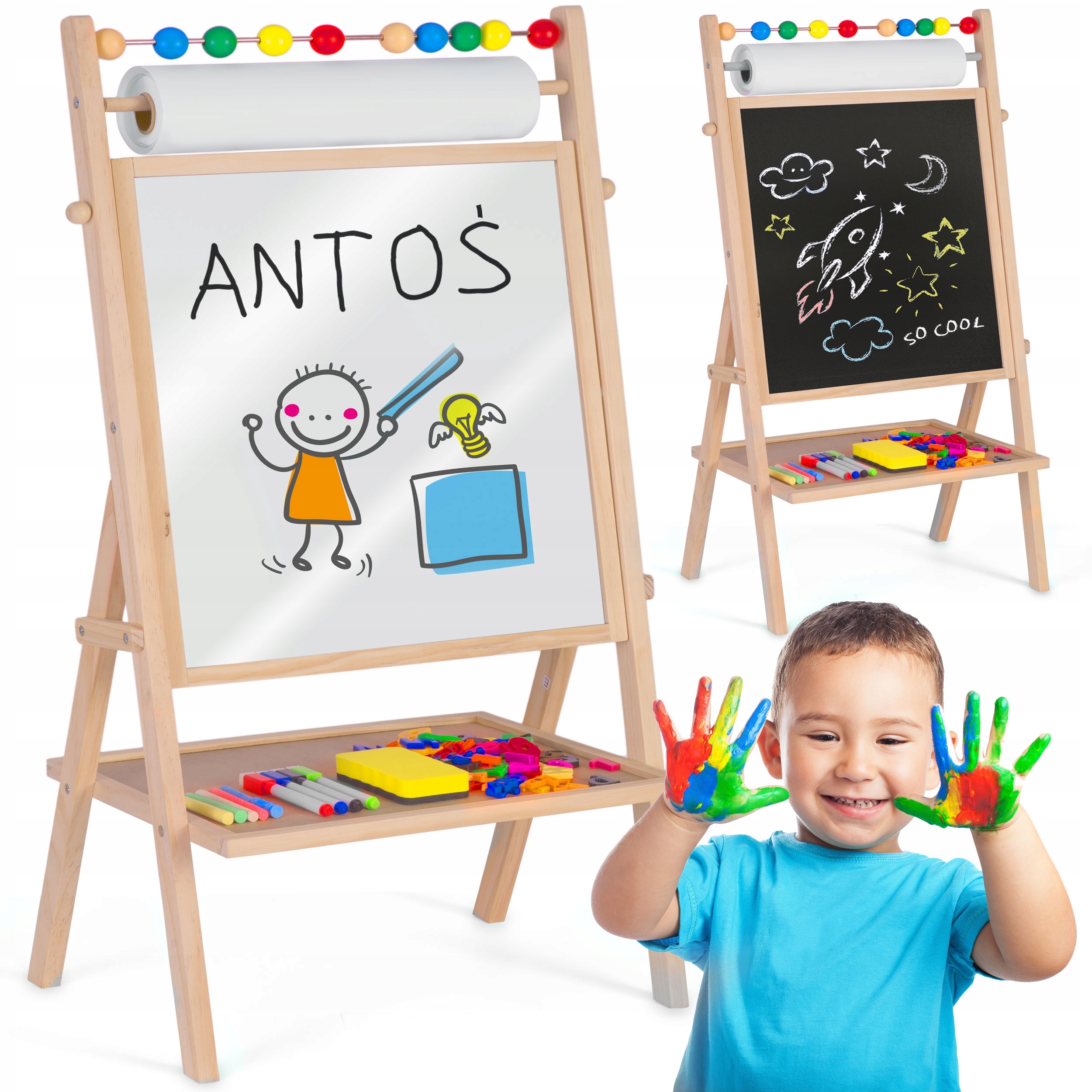 2️⃣ Усе включено – містить усі необхідні аксесуари, такі як рулон паперу, крейда, фломастери, рахівниці та магнітні літери та цифри, що забезпечує повну розвагу без додаткових покупок.