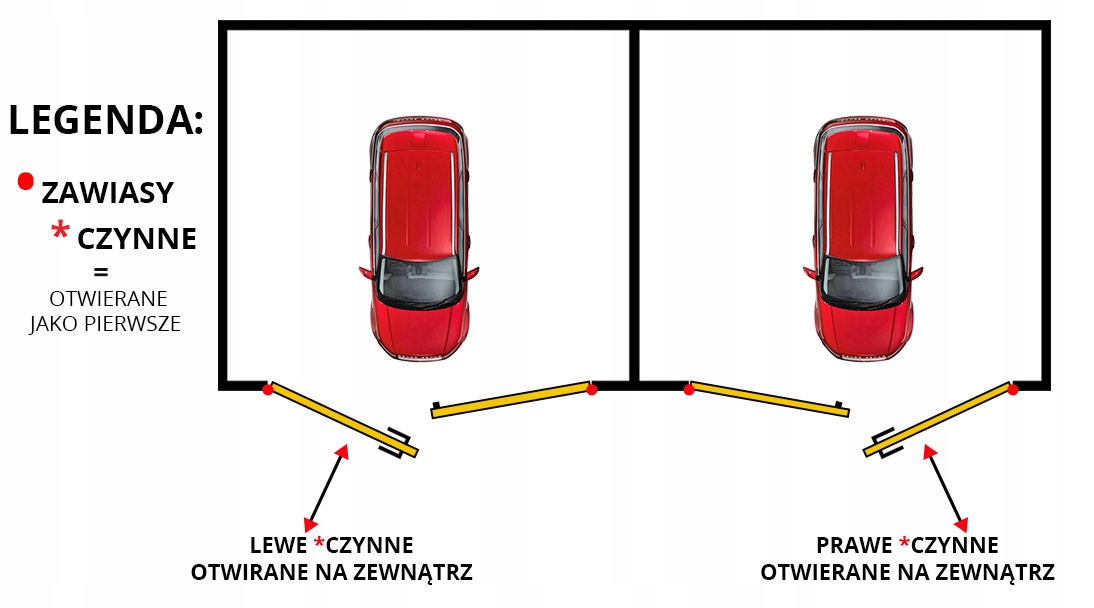 Двох гаражних дверей -це традиційне закриття гаражів, складських та економічних вхідних отворів. Структурна система та сучасна технологія виробництва індивідуально підібрані до кожної воріт забезпечують простоту обслуговування, стабільну та тиху роботу та безпеку використання. Подвійні ворота ідеальні як будівлі великих, високих гаражів або приміщень для зберігання. Покірування воріт покрита захисною фольгою, що захищає ворота для транспорту та складання. Додаткова теплова та акустична ізоляція забезпечується прокладкою. Одне крило (як правило, право) має блискавку з патентною вставкою та ручкою, інший -Роард вгору і вниз за допомогою замків Self -Shown.
