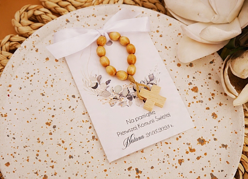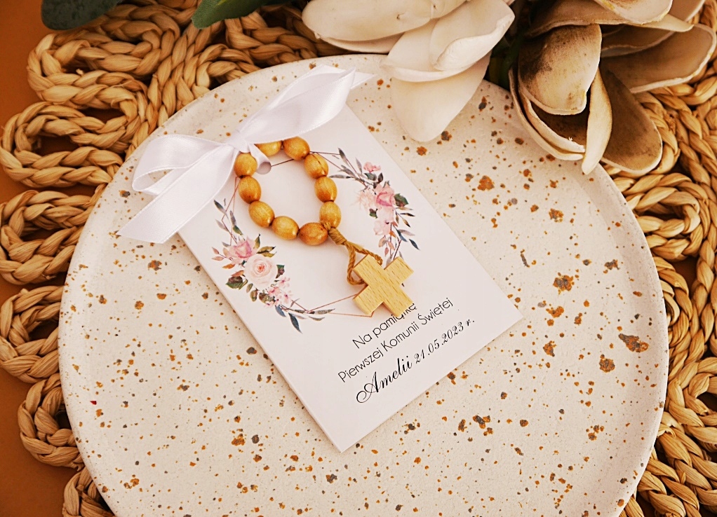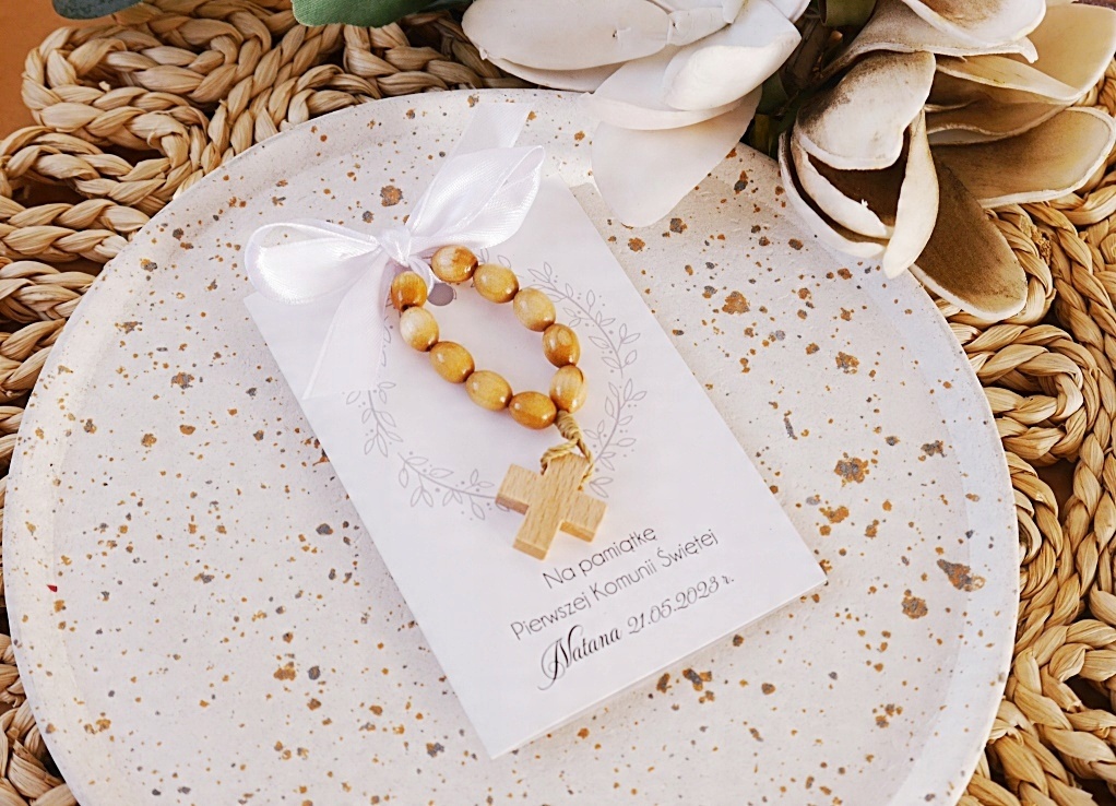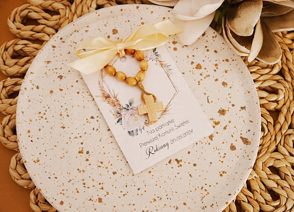 4 Приходячи геніально і дайте розарій персоналізованою етикеткою. Подарунок, готовий і готовий до передачі. Він може бути розміщений на тарілці або передати кожному гостю особисто. - Розподілений Розарій природного дерева/десять прикріплений до допомоги атласного лука на кожному мистецтві вибраний візерунок та ім'я та дата < /B> Багато візерунків у різних кольорах, щоб вибрати B> Один візерунок.