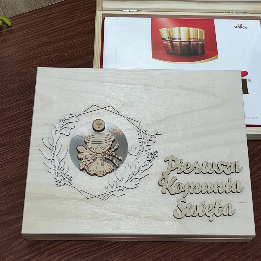 - The box on the top has a plywood cut from plywood: First Holy Communion, a cup of IHS placed in decorative Wianuszko