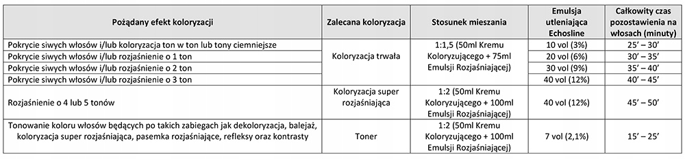 ПІДГОТОВКА: у неметалевій ємності змішайте крем-фарбу Echosline з окислювальною емульсією Echosline відповідно до показань, наведених у таблиці використання нижче:
