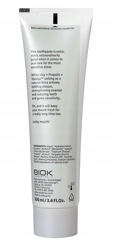 Натуральна зубна паста містить аж 98% натуральних інгредієнтів. Він заснований на багатофункціональній дії, завдяки чому ретельно очищає і доглядає навіть за найчутливішими ділянками зубів і ясен. Біла глина, прополіс і унікальний комплекс Teavigo™ є природним захистом від утворення зубного нальоту, зміцнюють емаль і усувають підвищену чутливість зубів і ясен. Додавання олії м'яти забезпечує тривале відчуття свіжості.