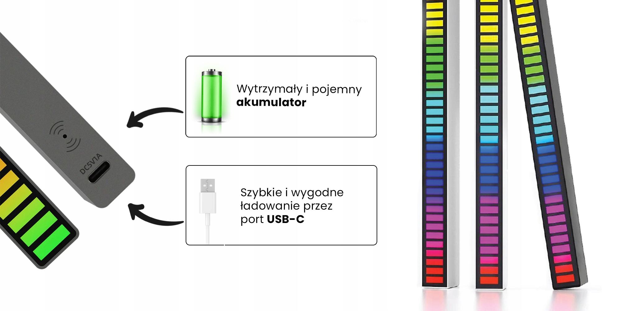 Вибравши еквалайзер Redleaf 40LED RGB, вам не доведеться турбуватися про заряд акумулятора. Ви можете швидко зарядити пристрій за допомогою павербанка, USB-порту комп'ютера або зарядного пристрою. У набір входить метровий кабель USB-A / USB-C, який полегшить це завдання. Про рівень заряду музичної панелі вас повідомлять сяючі світлодіоди, які будуть збільшуватися в міру додавання потужності.
