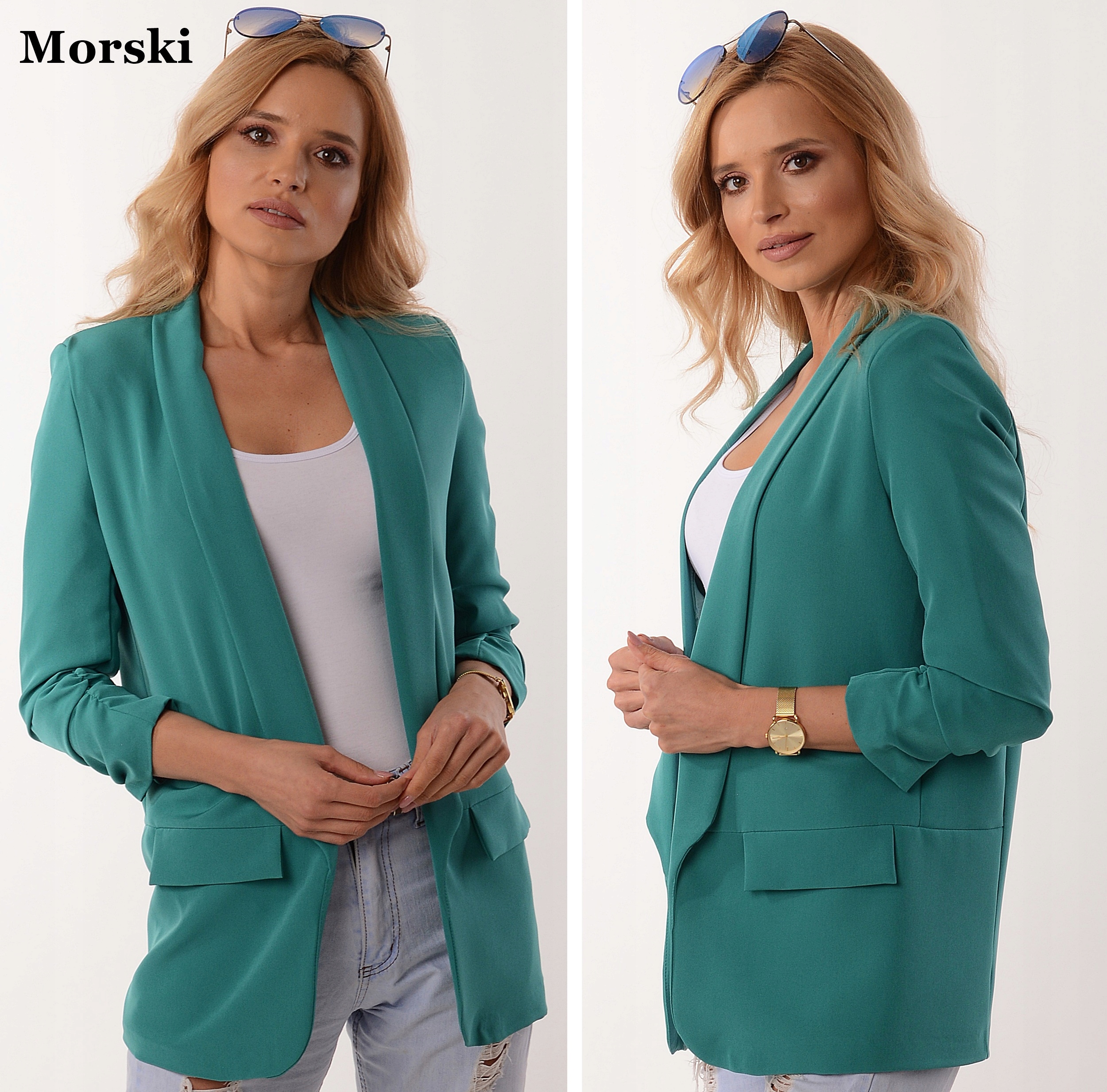 Ідеальне доповнення до вашого вбрання на роботу, в університет чи вечірній вихід. Драпіровані рукави довжиною 3/4 додають оригінальний характер. Імітація кишень з боків з ефектними клапанами прикрашає куртку. Вільного крою, з підкладкою та м'якими підплічниками.