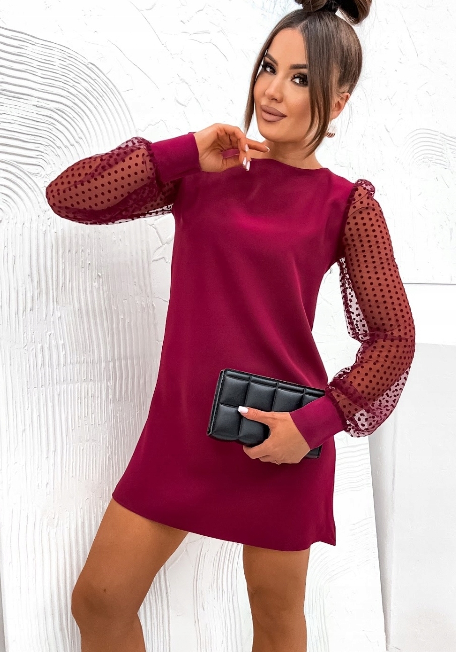 Чудовий жіноче міні плаття з легкої тканини. Виріб з довгими сітчастими рукавами (сітка не тягнеться). Сукня надягти через голову -. Модель із злегка трапецієподібним кроєм, виготовлена з приємного матеріалу, з елегантною обробкою.