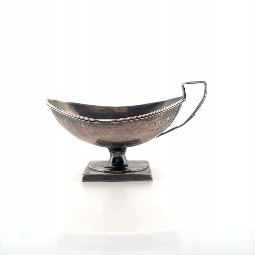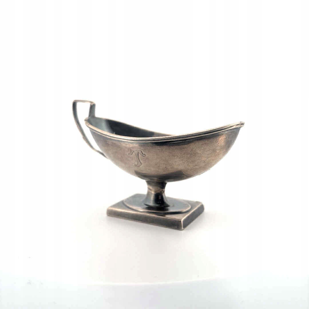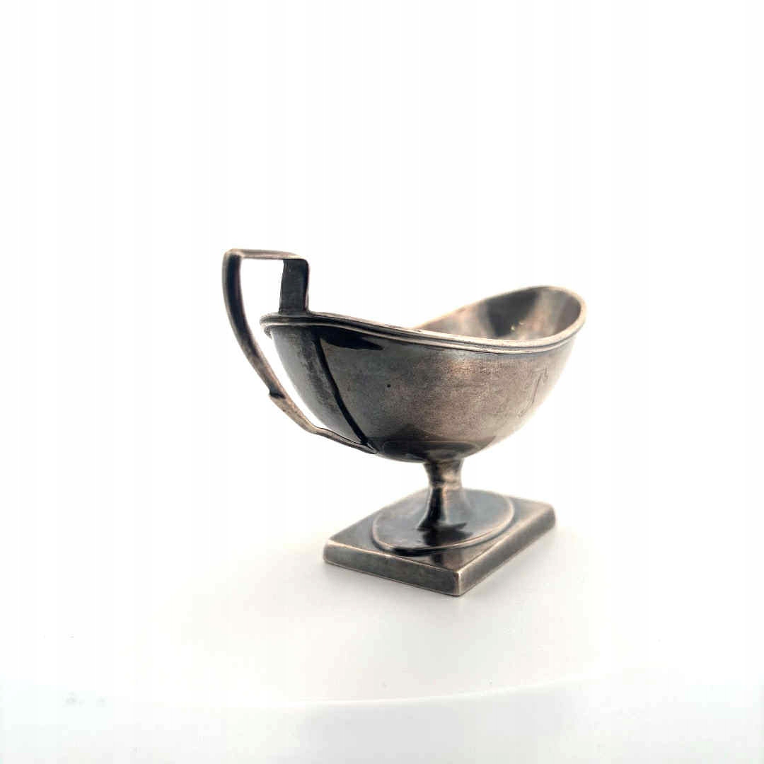 ☑soser, виготовлений із срібла, з класичною, елегантною формою. Він характеризується овальною глибокою мискою, вбудованою на тонку ногу з квадратною основою. Ручка проста, злегка зігнута, що надає легкість страви. Поверхня срібла має сліди природної патини, підкреслюючи її вік та характер. На бічній стіні є особливості свідчень, які вказують на тест на срібло та походження продукту. Ціле зберігається у позачасовому стилі, типовому для срібних виробів з першої половини 20 століття або раніше ..