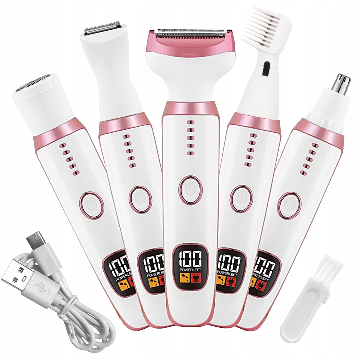 Бікіні -тример для жінок 5 в 1, бритва тіла для волосся в носі, обличчям, бровах, руках, ногах, руках, інтимних ділянках, змінна машина для гоління для жінок, безболіст з USB -зарядкою