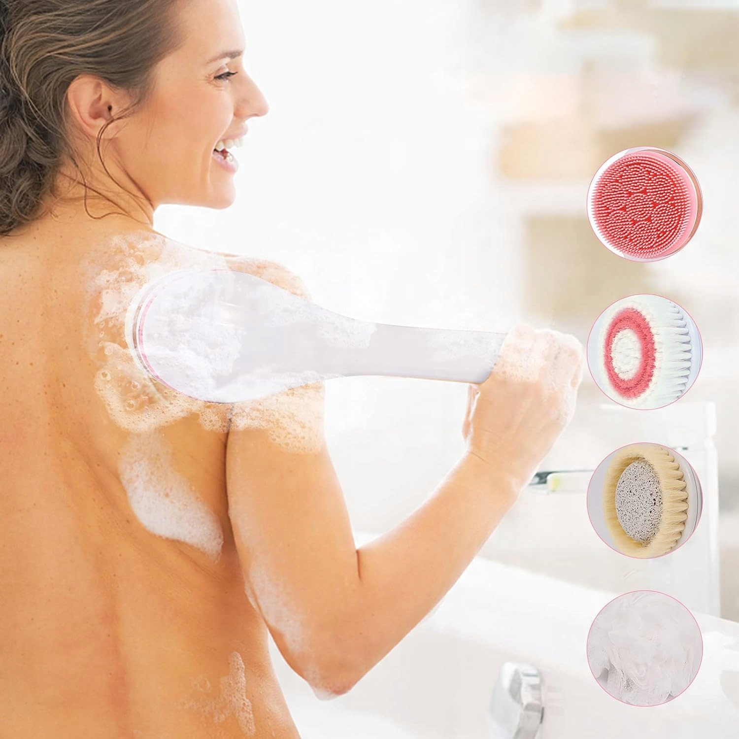 ✅Оснащено 5 знімними насадками для щіток, включаючи щітку для глибокого очищення, силіконову щітку для чищення, зручну щітку для душу, щітку для пілінгу для ніг і грязьова щітка, ефективно видаляє забруднення тіла, жир, мертву шкіру та навіть відлущує шкіру ніг.