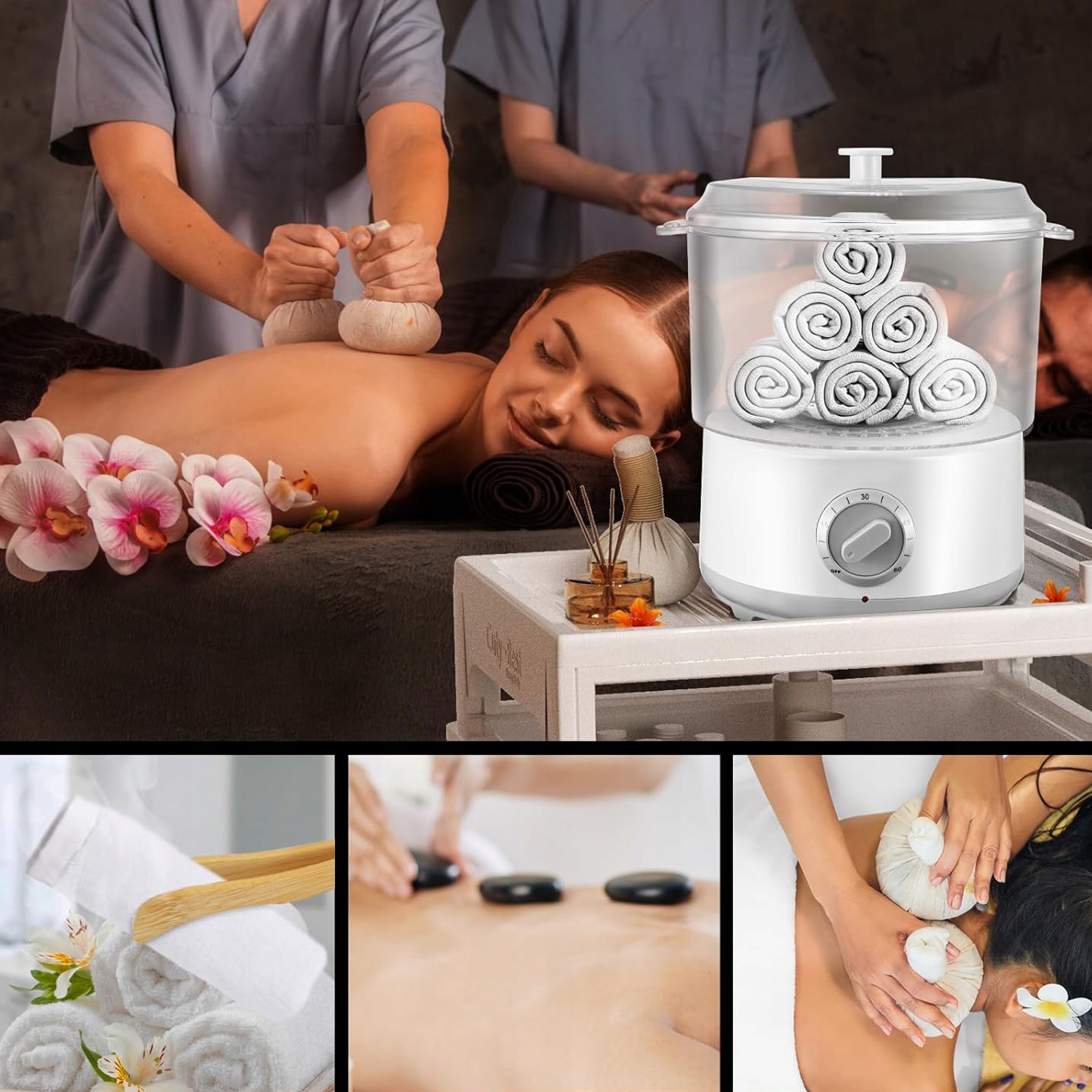 ✅【Швидке нагрівання】:рушникосушка використовує високоякісні та ефективні нагрівальні елементи, і пара може бути швидко вивільняється шляхом нагрівання рушників до 202°F за 5-10 хвилин. Він може розігрівати масажні камені (стандартний час: 5 хвилин), ароматерапевтичні мішечки (5-8 хвилин) і гарячі рушники (в рушникотримач вміщується 4-6 маленьких рушників або 3-4 середніх).