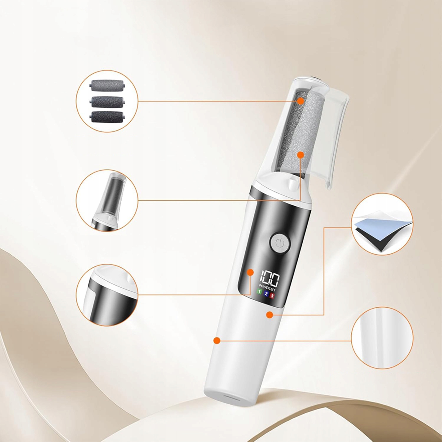 обладнана ефективним двигуном та 3 замінними шліфувальними головами: невеликий валик для тонкої мертвої шкіри, стандартний рулон для більш товстої шкіри, товсті валики для тріскуючих підборів або стійких відбитків. Ергономічна, не -ковзання ручки забезпечує безпечну та просту роботу, швидку та рідку.