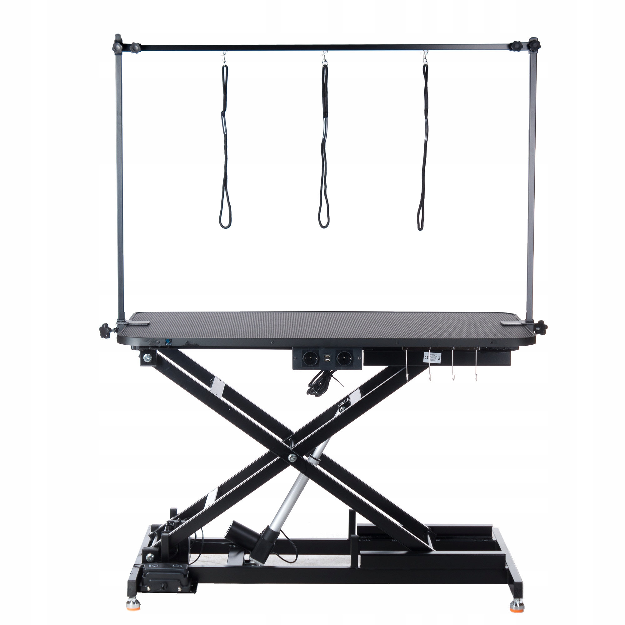 наречений для догляду за тваринами в розмірі XL. Надзвичайно стабільний верх, покритий чорним килимком проти слизу. Чорний сталевий каркас, пофарбований у порошок. Висота верху електрично регулюється, завдяки якому стіл буде ідеально пристосований для власних потреб та розміру домашнього улюбленця. Входить до набору, перехресна панель регулюється з трьома повідкою.