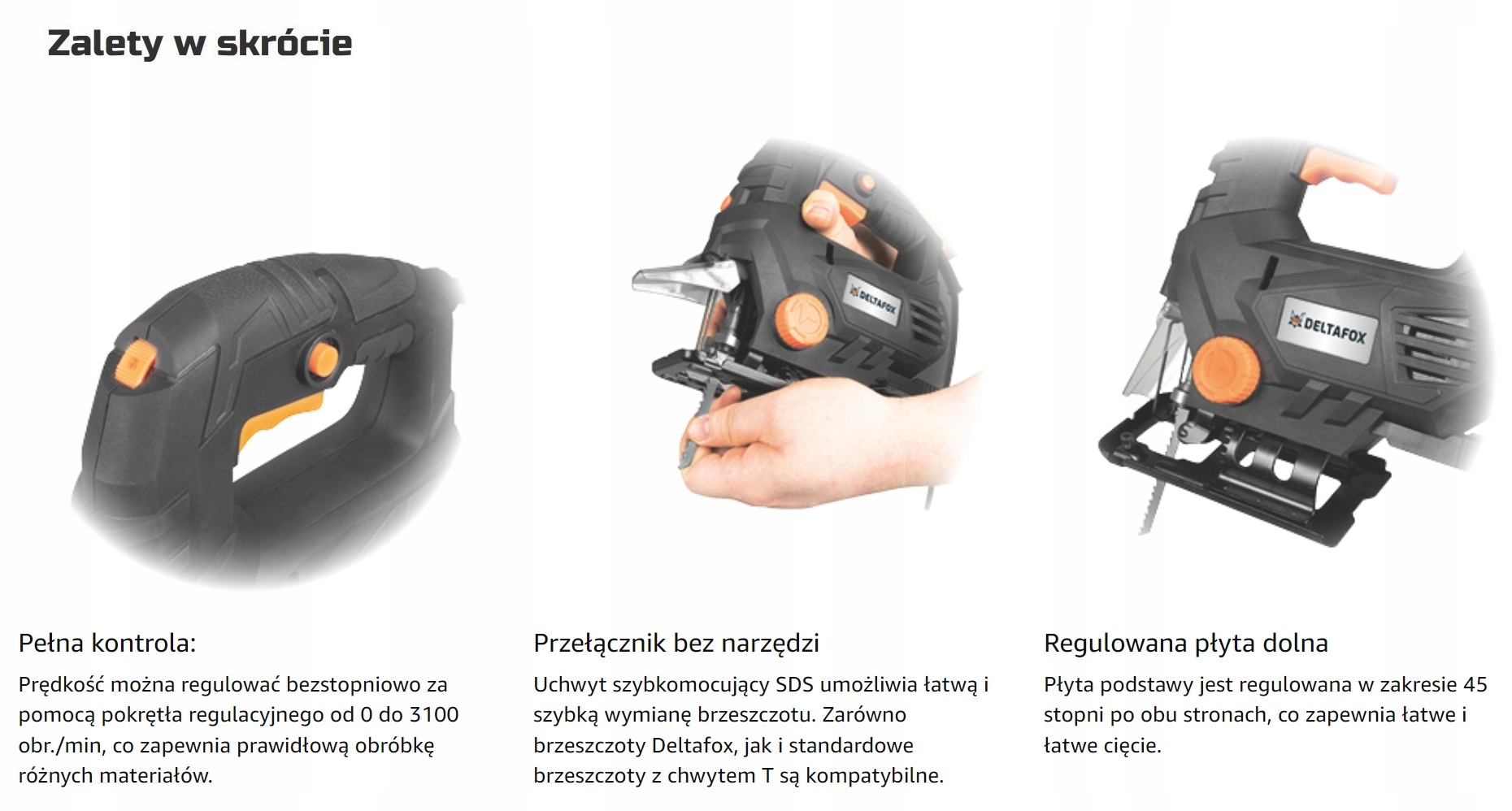 Лобзик DP-EJS 8080 від DELTAFOX є справжнім універсалом серед лобзиків. Оснащений лазером, плавним регулюванням швидкості, регульованою під кутом опорною пластиною та швидкомонтованим патроном SDS із 3-ступеневим ходом повороту, він значно полегшує роботу. Вбудований адаптер для зовнішнього пиловідведення дозволяє працювати в майстерні DIY без тирси. Лобзик сумісний з усіма доступними на ринку пильними полотнами з Т-хвостовиком. Їх можна легко зберігати у вбудованому ящику. Полотно для пилки по дереву вже входить в комплект поставки. Потужний двигун має потужність 800 Вт і швидкість до 3100 об / хв.