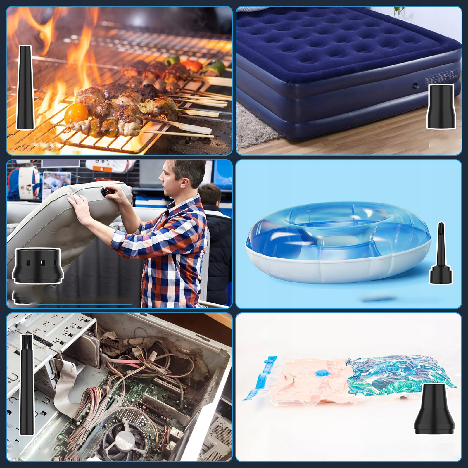 ✅ 【Багатофункціональний дизайн】: цей фен оснащено 6 насадками, які можна використовувати для зціджування, пилососу, зціджування тощо. Ви можете використовувати його за потреби чищення плавальних кілець, мішків для пилососів, чищення клавіатури, роздування багать тощо. Це багатофункціональний продукт. Обладнання, будь то на вулиці чи в приміщенні, є рідкісним помічником.