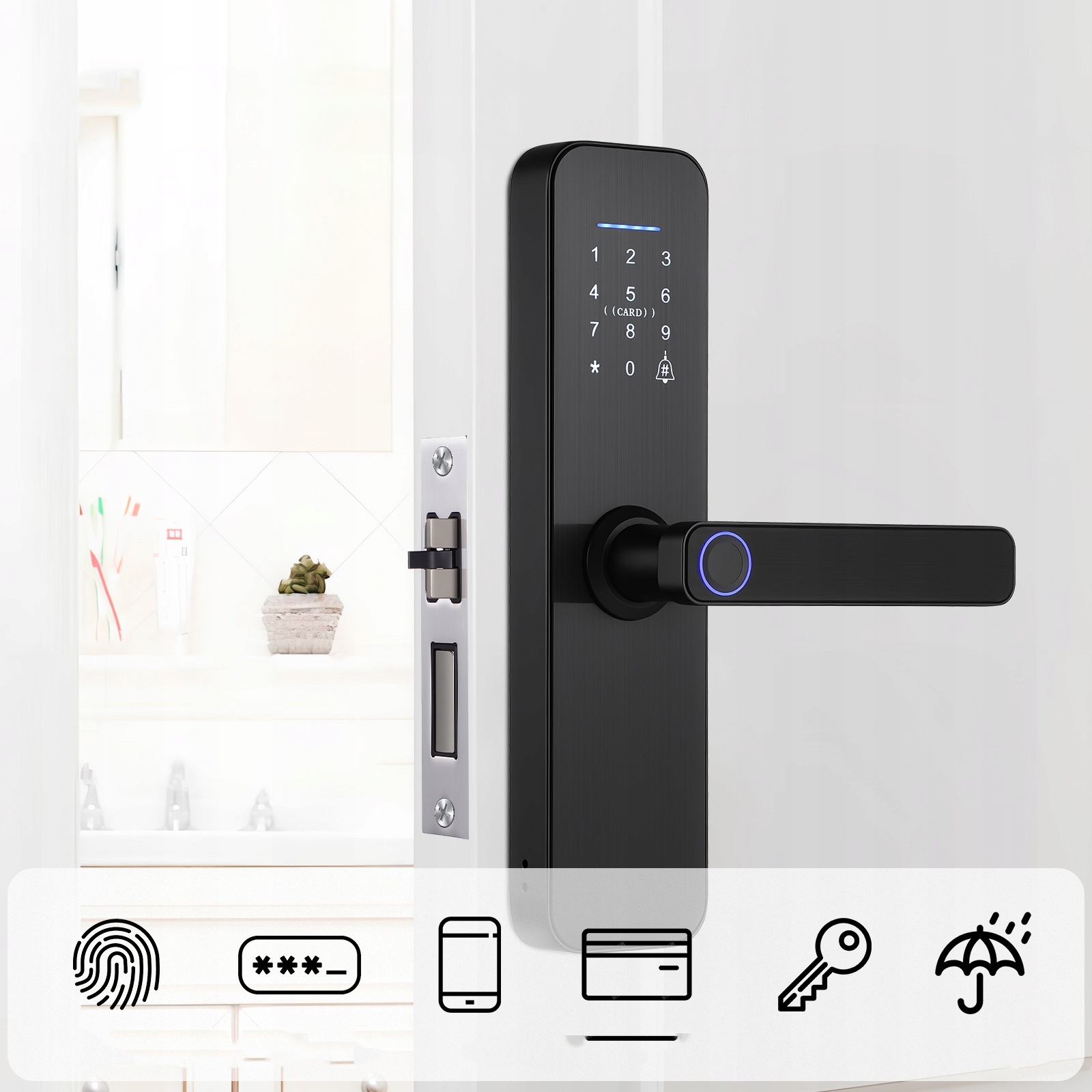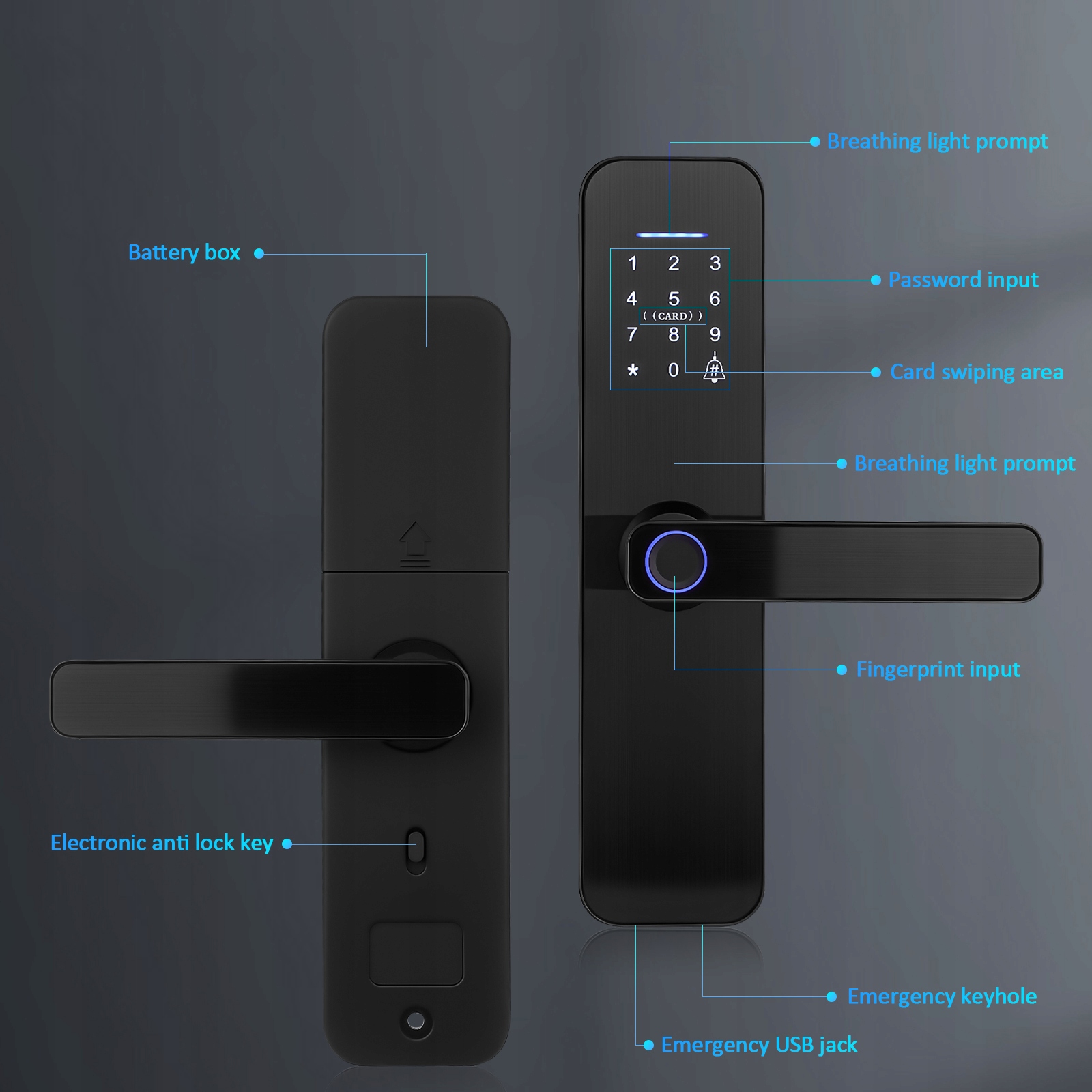 - Інтелектуальне блокування на відбитках пальців - це універсальне та безпечне рішення для вашого будинку чи офісу. Завдяки п’ятьм різним методам розблокування, включаючи відбитки пальців, пароль, ключову карту та ключ ключа, цей замок дверей гарантує, що лише уповноважені люди можуть отримати доступ. І більше не страху втратити ключі.