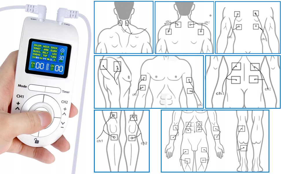 Двоханальний пристрій для стимуляції за допомогою EMS/TENS, використовує методи TENS та EMS з низькою частотою пульсу для полегшення болю або розслаблення вузьких ділянок. І завдяки виводу двох каналів дозволяє використовувати його двома людьми або в різних областях.