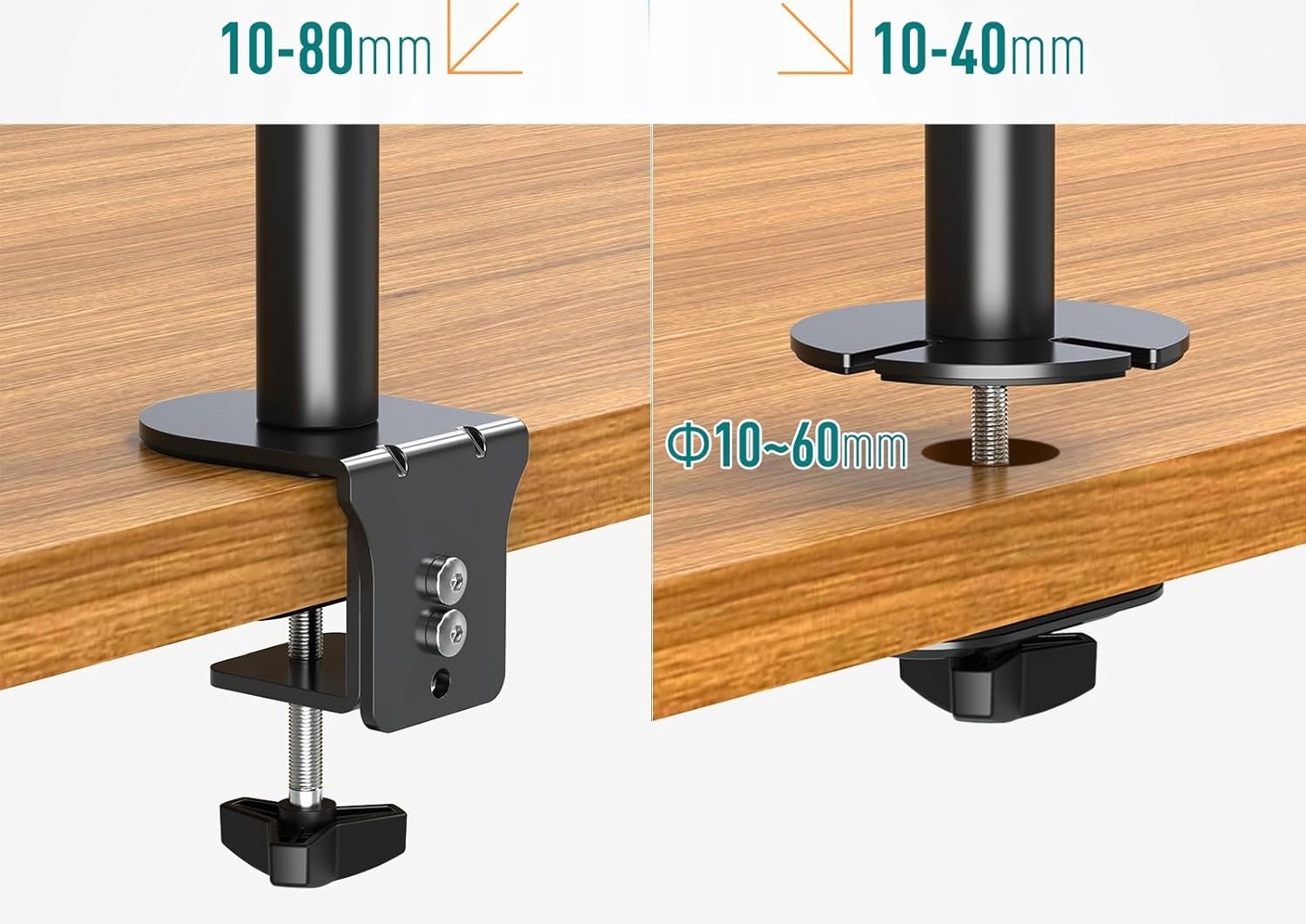 - Легка установка - знімна плата VESA полегшує прикріплення монітора. Підтримує збірку за допомогою C (без буріння) та громтів (необов’язково). Підходить для більшості столів товщиною 10 мм - 80 мм або 10 мм діаметром - 60 мм