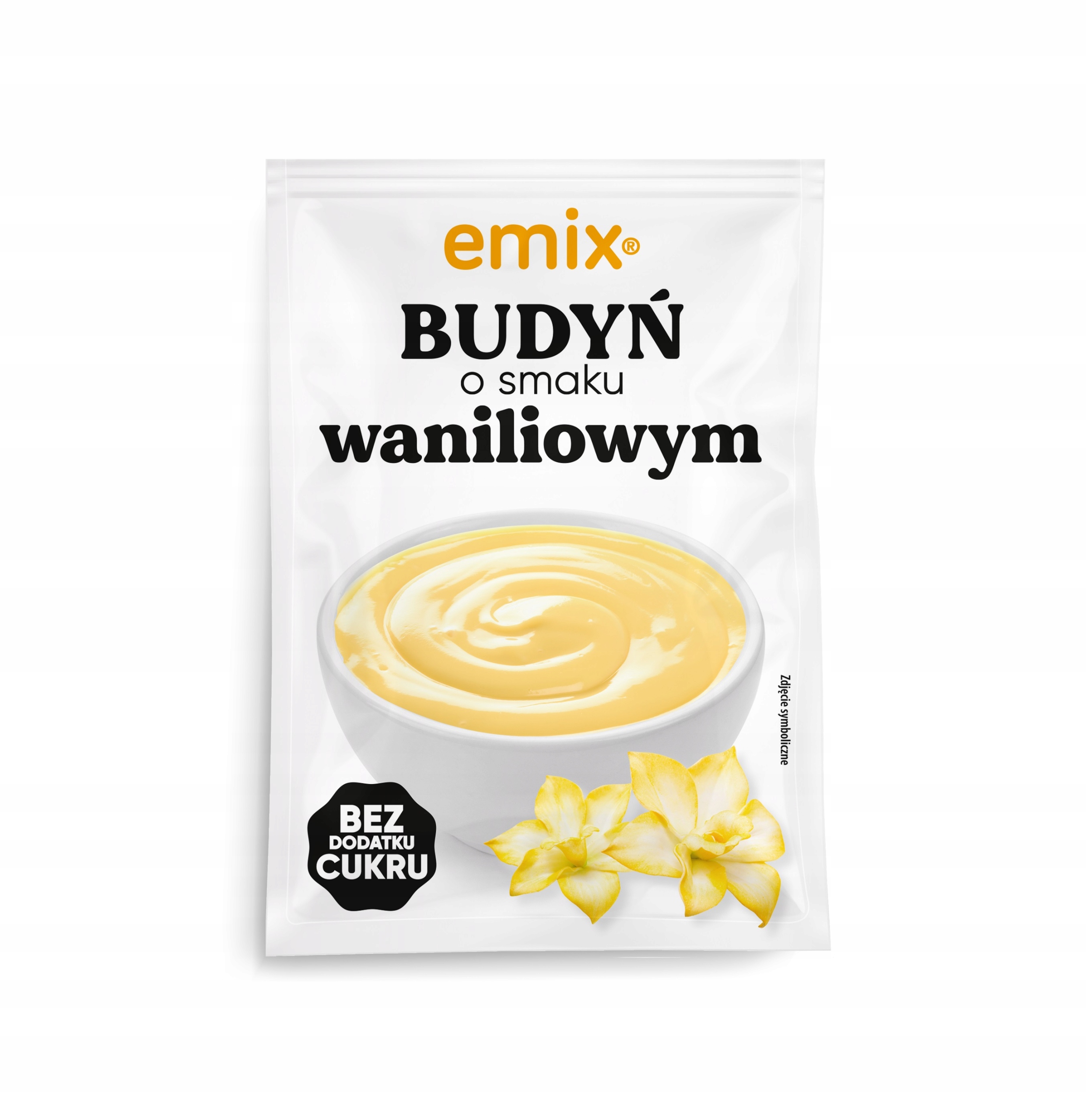 Emix - це пудинг без додавання цукру та підсолоджувачів. Пудинг -порошок містить коротку композицію. Це смачний десерт, який сподобається кожному шанувальника унікальних смаків. Пудинг рекомендується з додаванням свіжих фруктів, домашнім соком або зі збитими вершками. Підходить для тортів і як основа для млинця. З 0,5 літрів холодного молока налийте половину скла і змішайте вміст мішка з 2 столовими ложками цукру або ксилітолу (або іншої підсолоджувальної речовини).