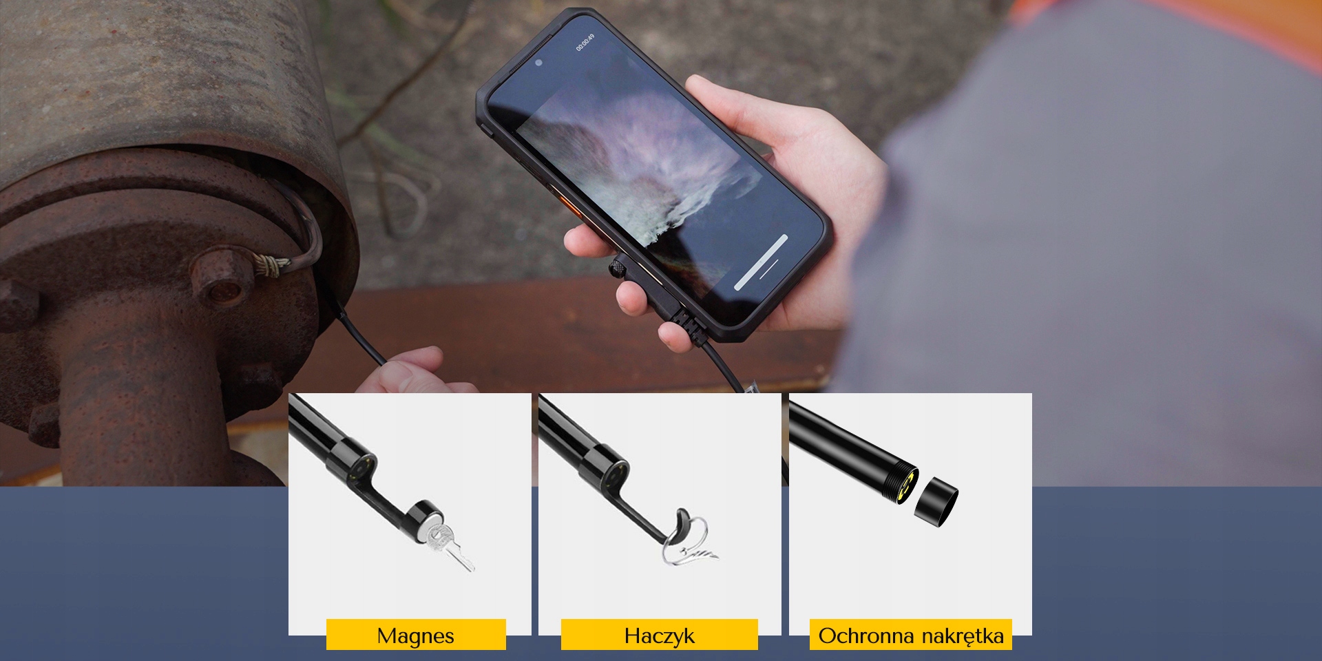 Багатофункціональні накладки розширюють можливості ендоскопа. Для таких предметів, як ключі, каблучки чи ювелірні вироби, гачок чудово підходить для їх витягування; тоді як магніт добре притягує маленькі залізні предмети. Додатково в комплект входить захисний ковпачок для об'єктива камери.