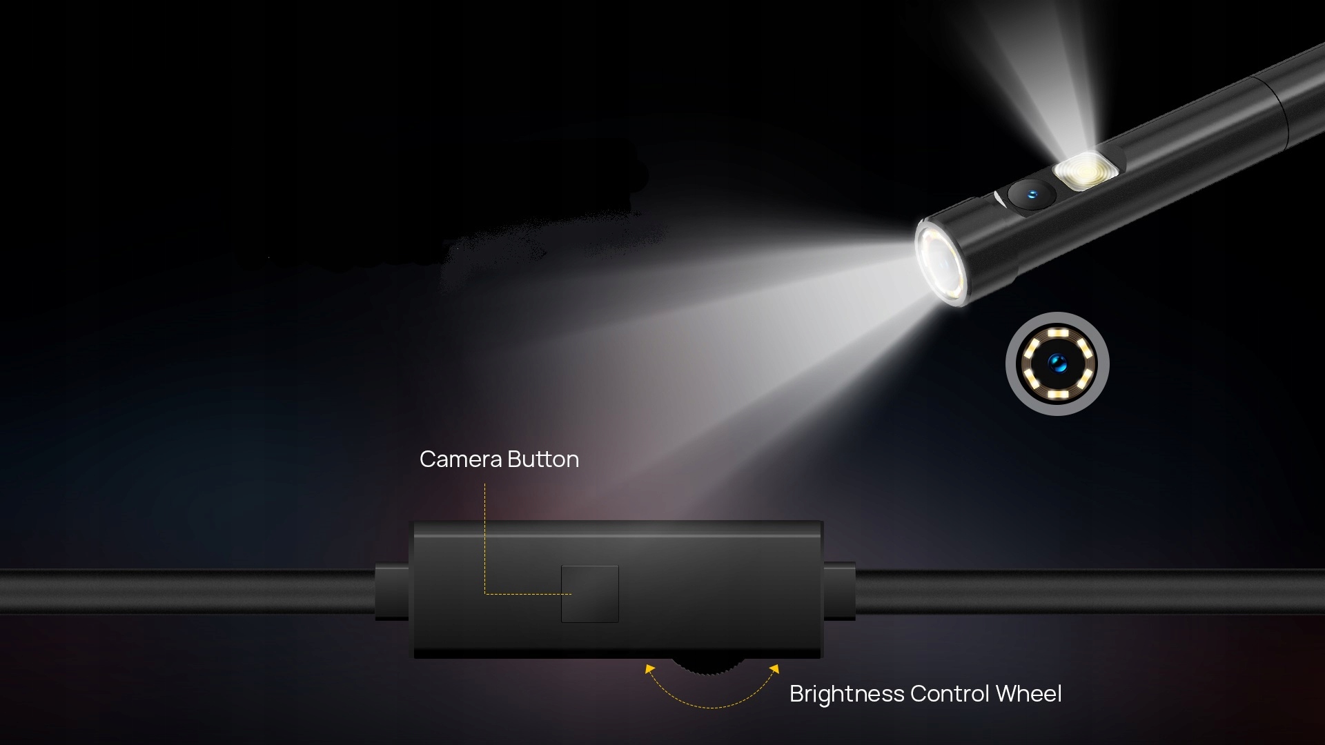 Фронтальна та бічна камери ендоскопа мають світлодіоди, яскравість яких можна регулювати за допомогою поворотної ручки на кабелі. Висока яскравість 7 світлодіодів дозволяє чітко бачити в темряві.