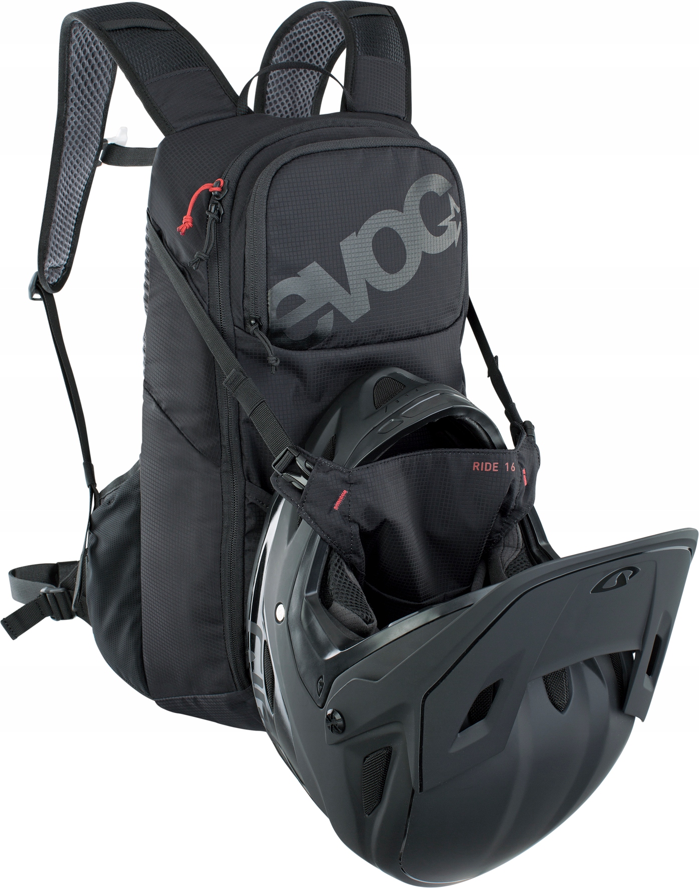 EVOC RIDE 16 L дуже універсальний, він добре працює під час їзди на велосипеді, ходити в гори і навіть під час повсякденного використання. Основна його перевага - дуже низька вага. Серед спереду є кишеня -шолом і маленька кишеня, наприклад для окулярів. Основна камера має організатор, що складається з двох сітчастих кишень, кріплених блискавкою та 2 сітчастими відсіками. Крім того, основна камера оснащена купою, присвяченою купі. Система повітряних майданчиків заснована на профільних подушках відстані, що дозволяє рух повітря між ними під час використання. Скримовий пояс рухається і оснащений свистом, тоді як тазостегновий пояс має 2 гнучкі сітчасті кишені, наприклад для енергетичних барів. Додатковою перевагою цієї моделі є бічна кишенька еластичної сітки, ідеальна для транспортування пляшки з водою.