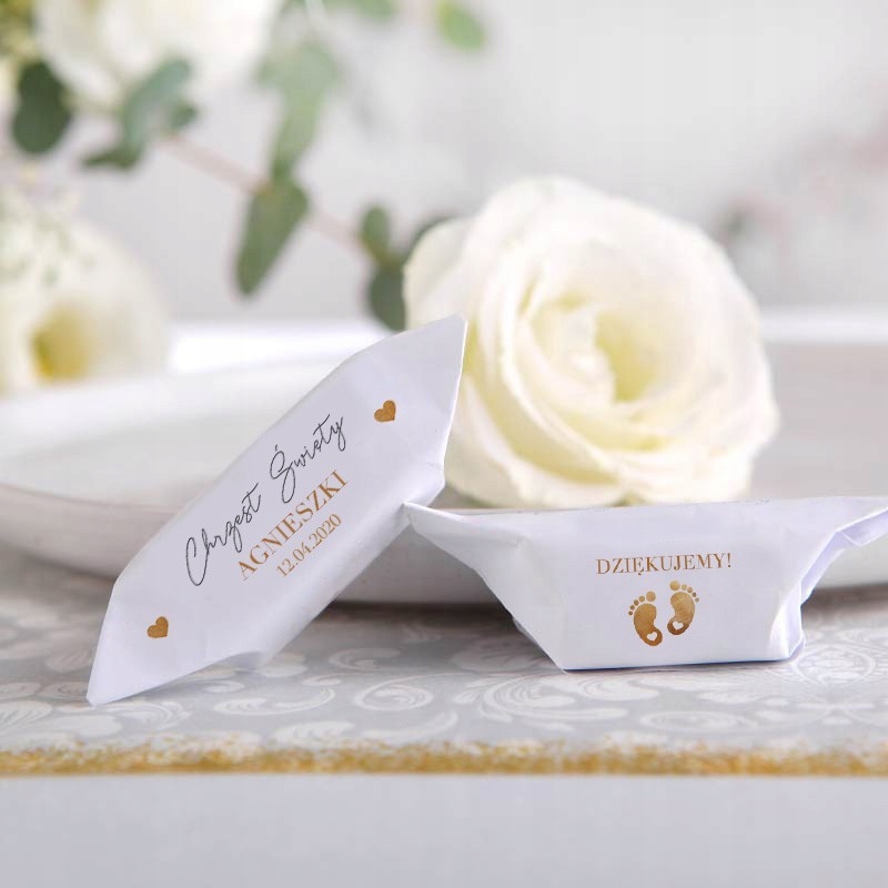 - помадки загорнуті в білий папір, прикрашені іменем дитини, датою хрещення, зображенням золотих ніжок і сердечок і написом «Дякую»