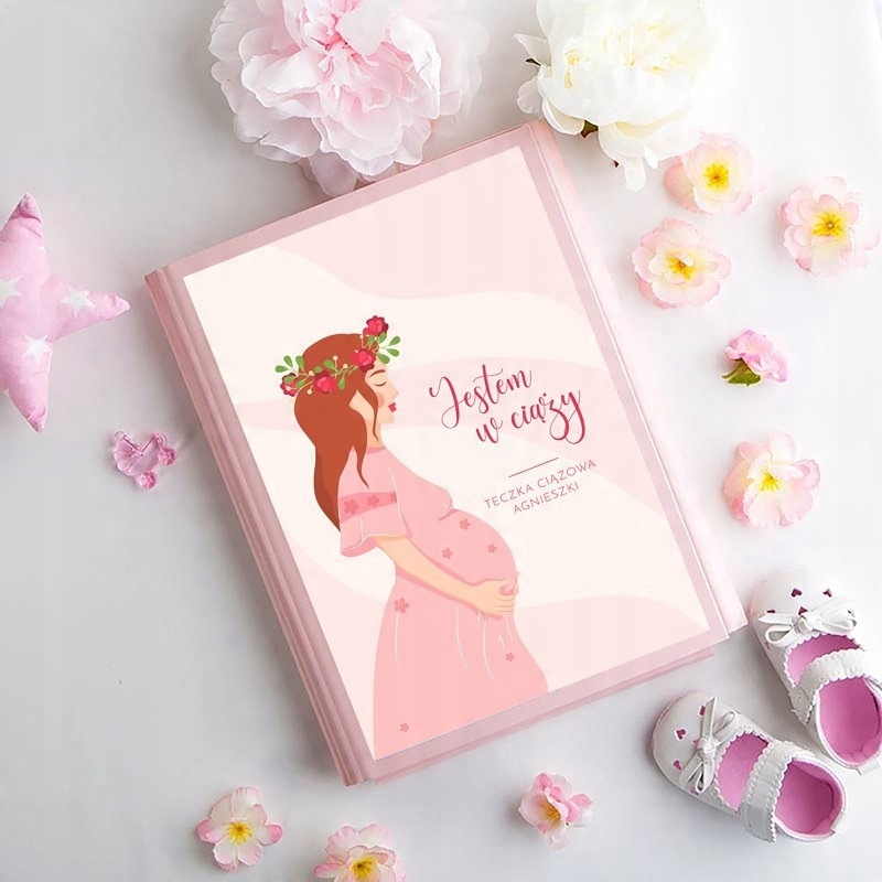 - композиція: папка рожевого кольору з цупкого картону, закривається на дві застібки-липучки, на лицьовій стороні самоклеюча наклейка з красивим зображенням майбутньої мами та написом я вагітна, а також ім'я; з твердого картону товщиною 2 мм; кольоровий з одного боку, покритий фольгою