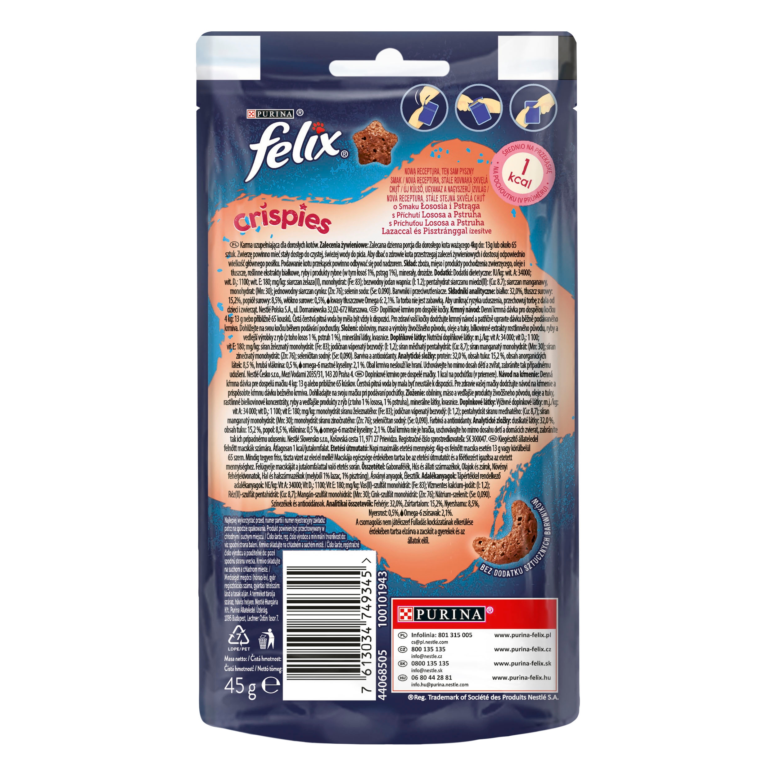 частіше винагороджуйте свою кішку і поділяйте з ним ще більш поширеними пустотливими моментами! Загрожно наповнені закусками Felix Crospies мають унікальну легку та хрустку текстуру, щоб ви могли балувати свою кішку щодня. Здивуйте свою кішку смачним хрустким у кожному укусі та захоплюючому поєднанні смачних ароматів, форм та кольорів у кожній упаковці!