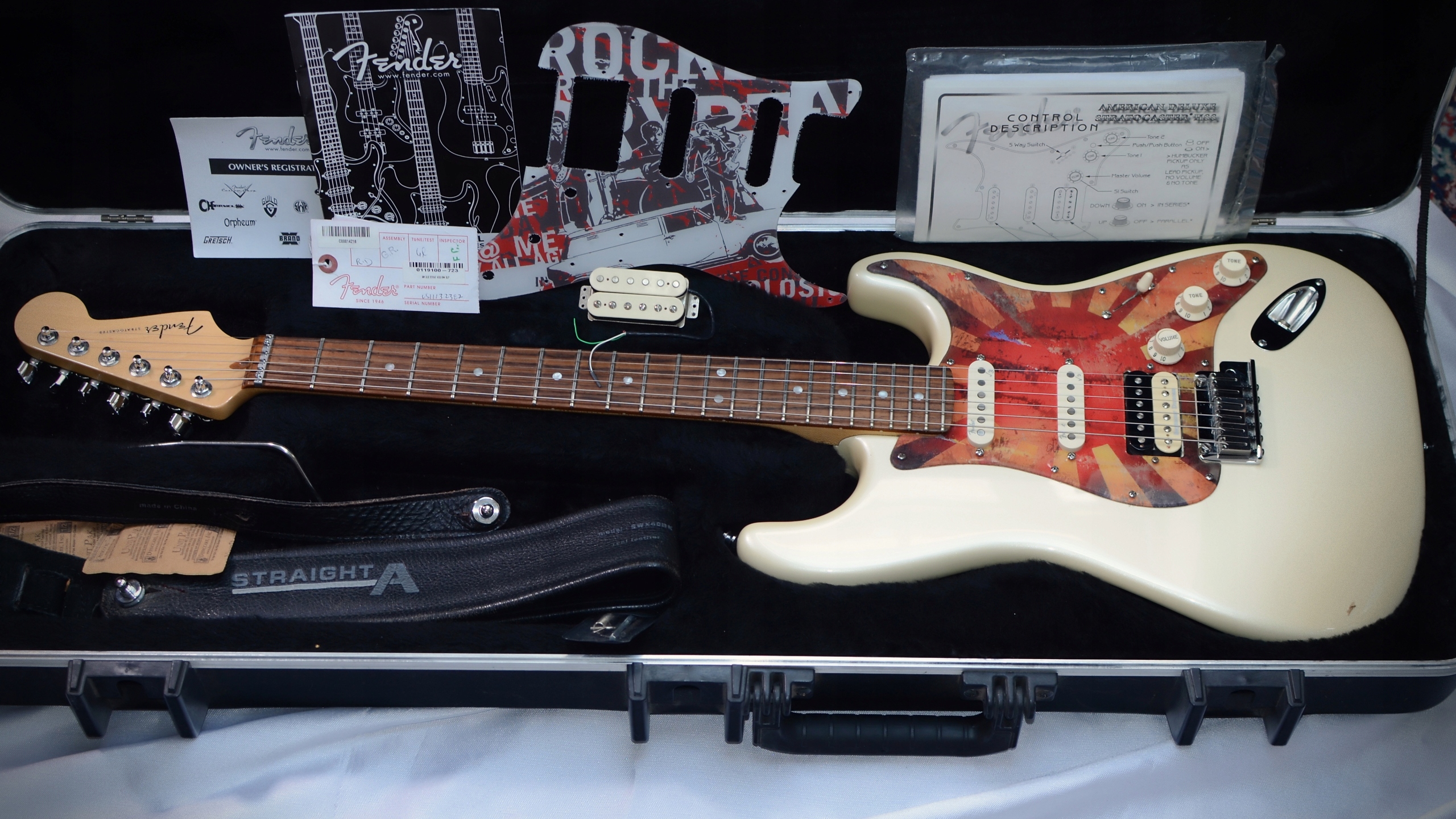 Підкрилка AMERICAN DELUXE STRATOCASTER HSS, 2011р. США, колір Olympic Pearl. Гітара в гарному стані, корпус з вільхи, гриф з клена. Обладнання оригінальне. Сингли є оригінальними, Noiseless N3, оригінальний хамбакер Fender DH-1 був видалений (у комплекті) і замінений на звукознімач Seymour Duncan SH6, з можливістю відключення на сингли. Комплектація оригінальна, ключі на замку. Табличка поміняна, додається ще одна на фото, оригінальної немає. В комплект входить оригінальний чохол і важіль. Гітара грає та виглядає чудово, я дуже рекомендую її та запрошую вас випробувати.
