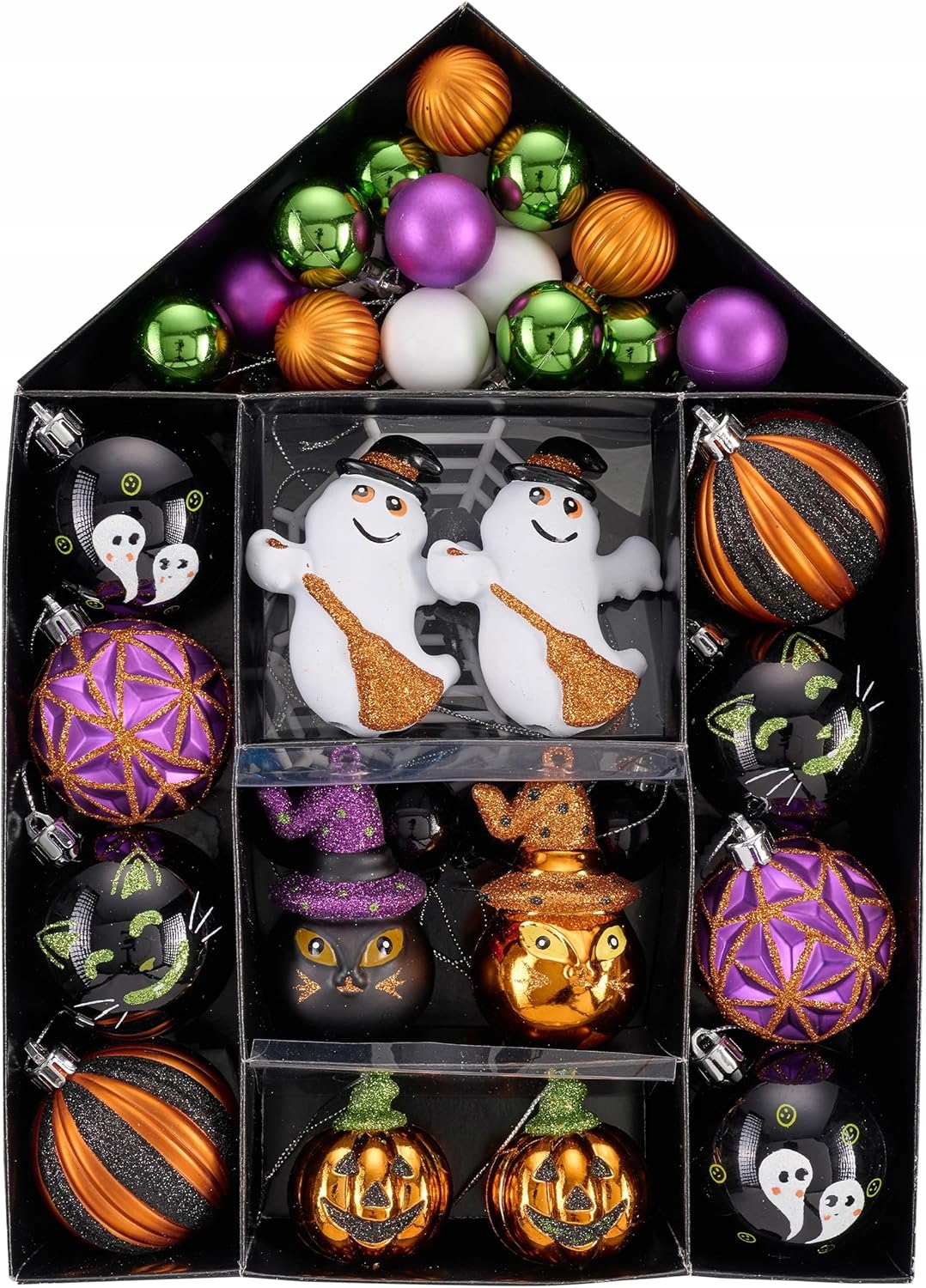 Набір включає різноманітні прикраси у формі гарбузів, привидів, кажанів і котів, які радують яскравими помаранчевими, фіолетовими та чорно-білими акцентами. Це ідеальний спосіб додати чарівну та таємничу атмосферу Хеллоуїна в будь-який інтер’єр.