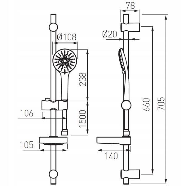 - Ковзний металевий стрижень 705 мм - душовий шланг з латунним обплетенням 1500 мм