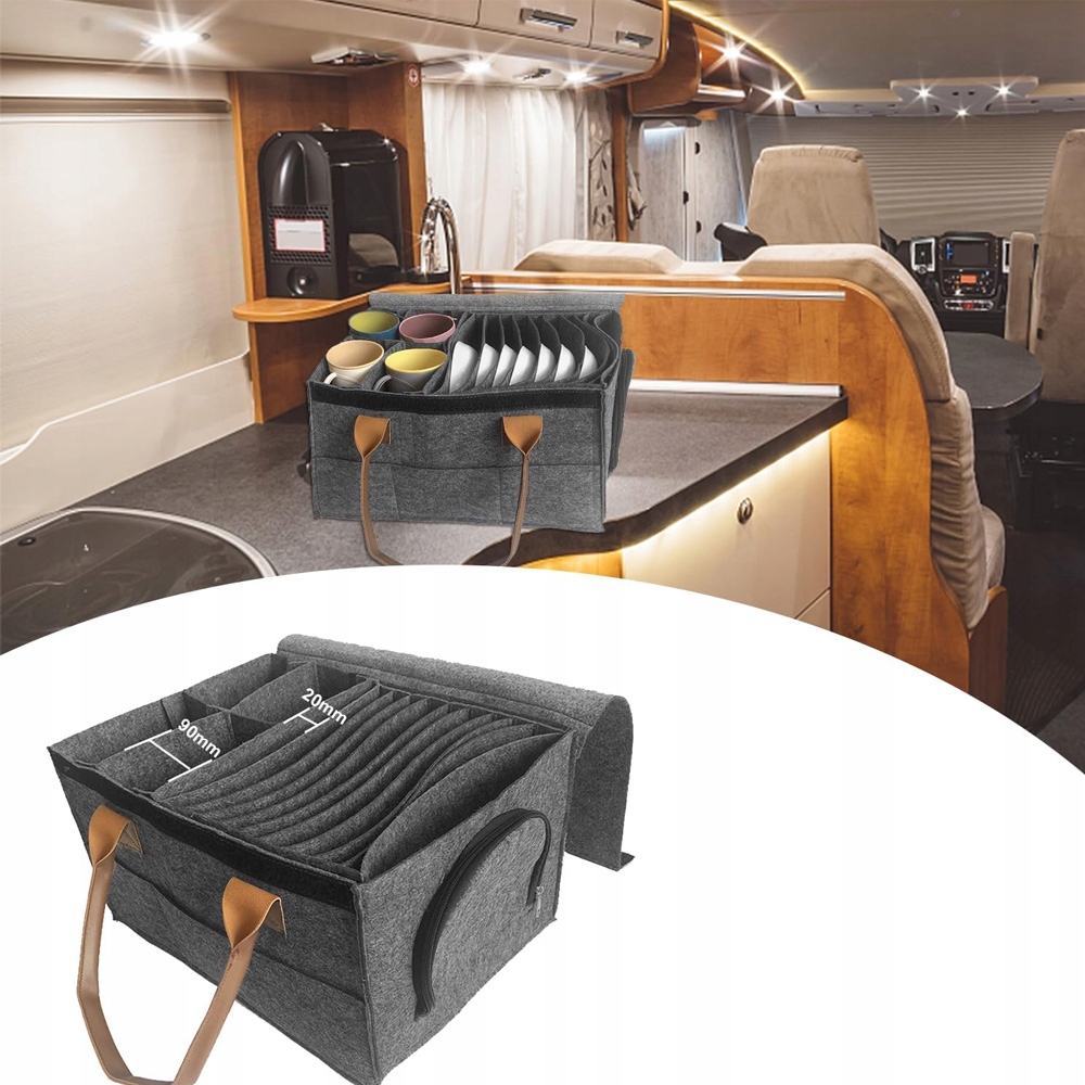 Власник посуду фетрового таблиці має 8 -кратні відсіки для пластини та 4 -кратні відсіки чаші, а на зовнішній стороні мішка столових приладів є вісім маленьких кишень. Контейнер для столових приборів для кемпінгу може гнучко вмістити різні розміри мисків, тарілок, чашок, ножів і виделок тощо.
