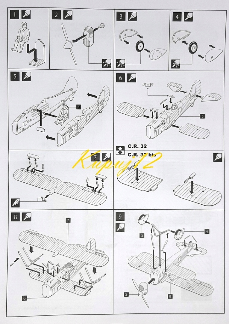Пластикові елементи слід вирізати з кадрів, встановити та склеювати відповідно до прикріплених інструкцій складання.
