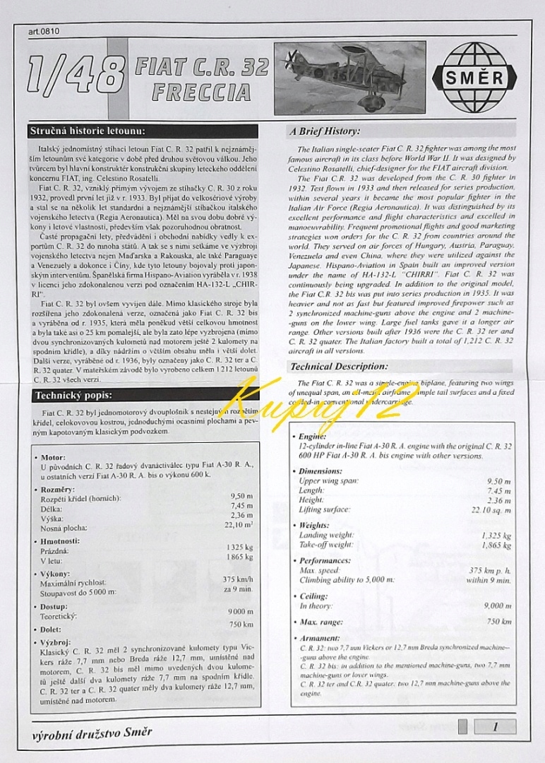 Набір містить точну пластикову модель для приклеювання шкали Fiat CR-32 Freccia 1:48