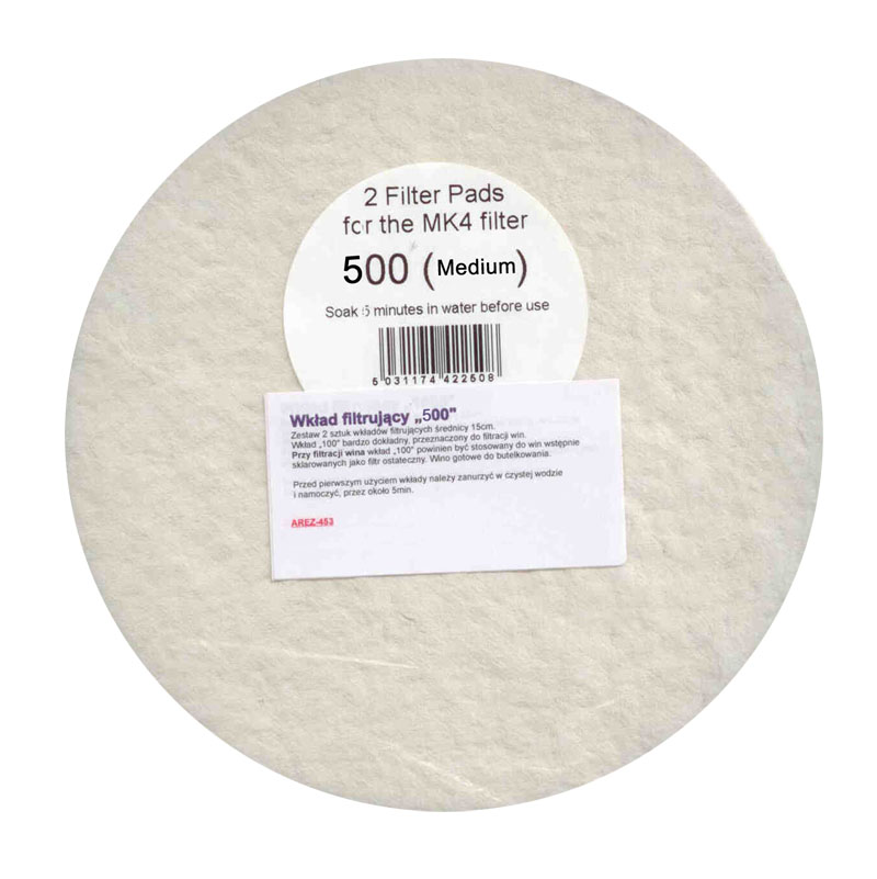 Набір з 2 штук фільтрувальних вставок діаметром 15 см для фільтраційного апарату. Картридж «500» середньої тонкості, призначений для фільтрації вина. Картридж «500» слід використовувати для попередньо освітлених вин. Перед першим використанням вкладиші слід занурити в чисту воду та замочити приблизно на 5 хвилин.