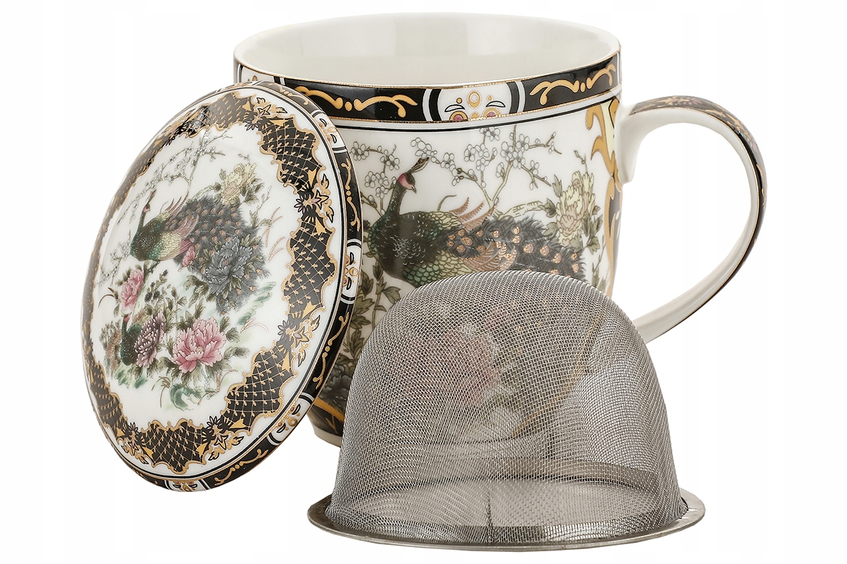 витончений набір, який складається з кружки з металевим ситечком і обкладинкою, прикрашеним мотивом павича. Набір виготовлений з високоякісного порцеляни, що дає впевненість, що він буде довговічним і довговічним. Унікальна стилізація та висока точність роблять набір чудово виглядати на столі. Весь упакований у прикрашеній картонній коробці. Набір включає: