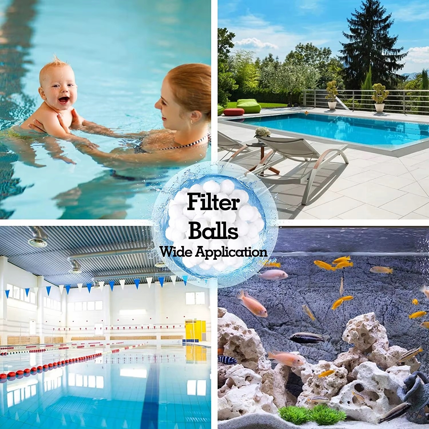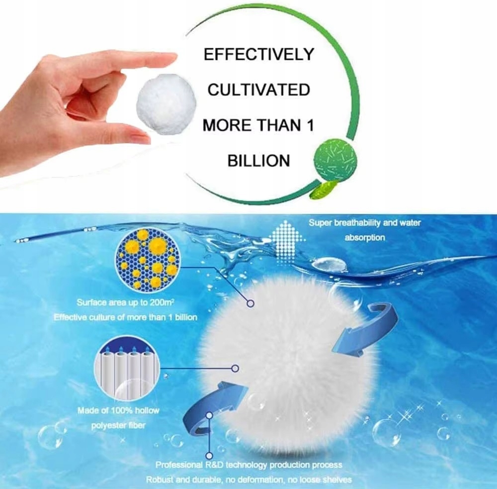 1. Можливість Множинне використання - кульки можна промивати вручну або в пральній машині. Низька Шкала кульок забезпечує простішу підтримку фільтра 4. Дуже висока фільтрація 5. Простіший потік води, менший опір, що вимагає менше потужності насоса. Менше Використання води та енергії. Продукт підходить для фільтрації басейнів, акваріумів, ставків. Продукт не токсичний. 100% поліестерний матеріал.
