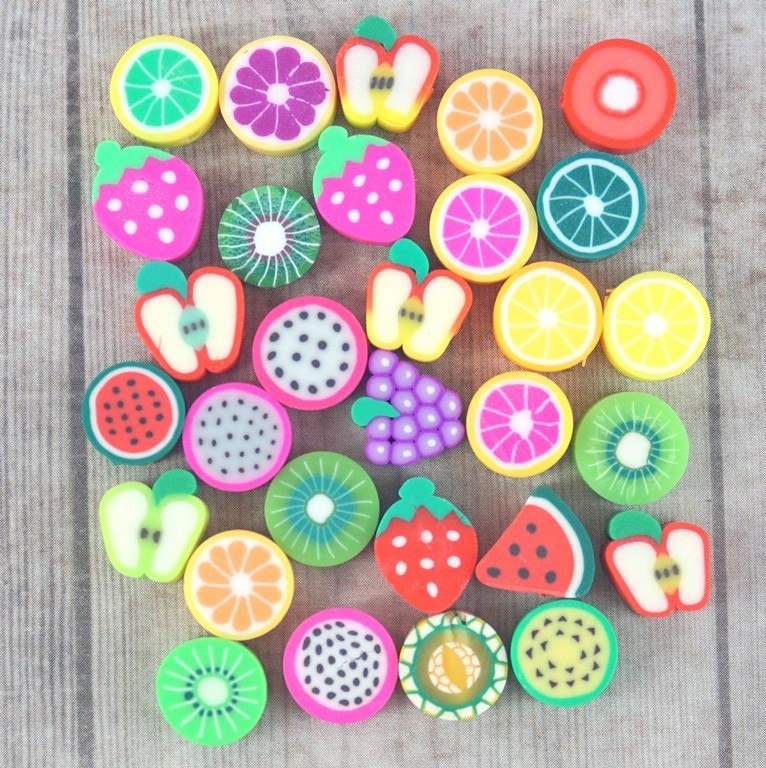 Бісер з полімерної глини ФІМО, суміш різнокольорових і смачних фруктів 30 шт. (яблука, полуниця, апельсини, манго, лимон). , ківі, кавун, огірок, помідор, суниця...) діаметр близько 10мм, товщина 4-5мм ціна за 30шт(намистини мають отвір для прорізання діаметром 1,5мм )