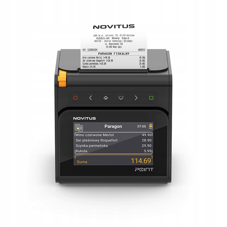Принтер Novitus POINT — найновіший фіскальний принтер Novitus, призначений для вашого бізнесу. Принтер оснащений рядом інноваційних програмних функцій і технологічних рішень. На додаток до високоякісного механізму друку, який забезпечує дуже швидкий друк, і точного різака паперу, принтер оснащений кольоровим дисплеєм, на якому відображається вміст квитанції та назви проданих товарів, або (також графічне) меню принтера. Принтер працює в двох положеннях: з піднятим дисплеєм вгору і до клієнта, а друкарський механізм подає папір до оператора, або з друкарським механізмом вгору і дисплеєм клієнта вперед. Кожен може пристосувати позицію своєї роботи до своєї позиції продажів.