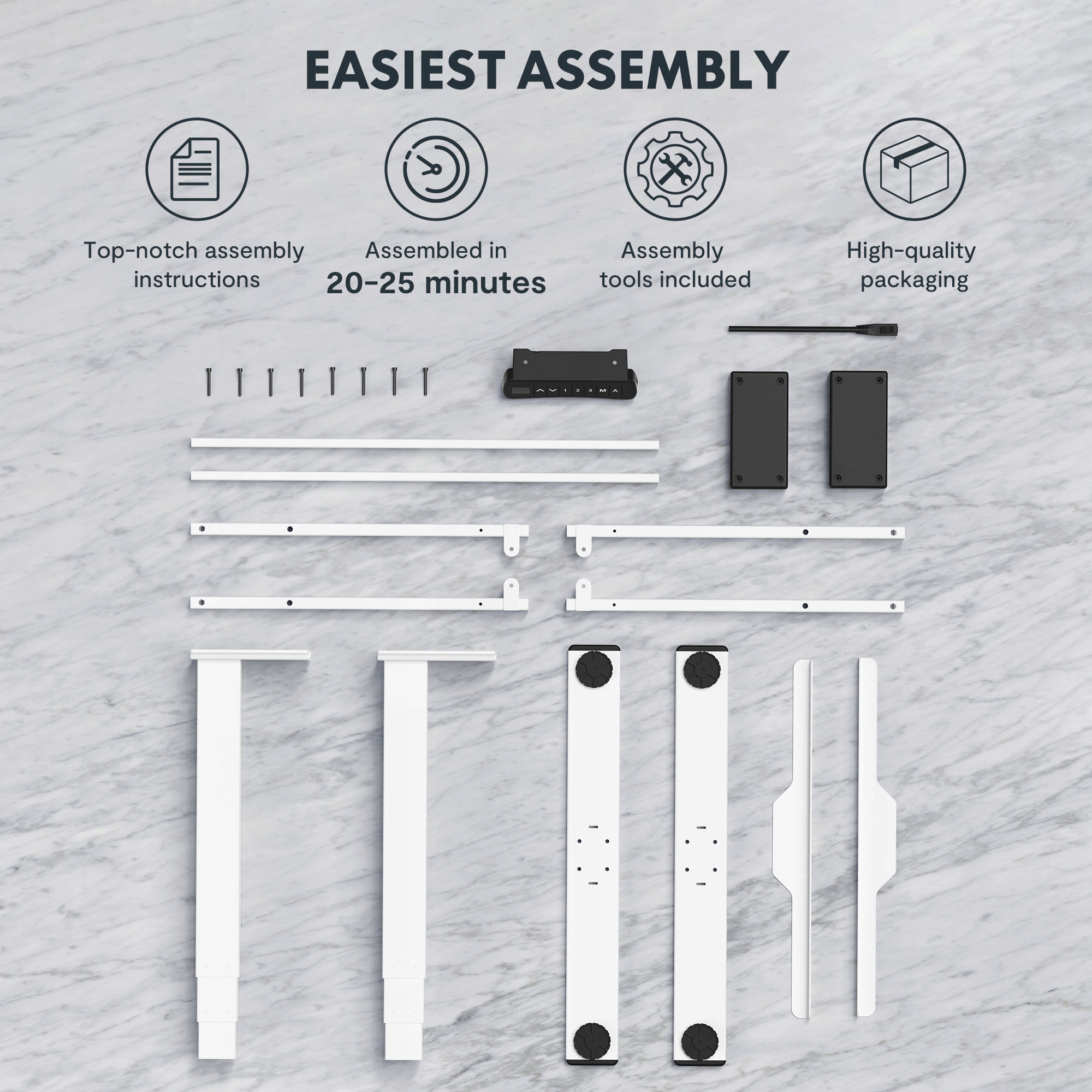 Інші регульовані столи часто важко зібрати та голити. Наш електричний стіл Flexispot був розроблений для того, щоб легко встановити та містити інструменти та інструкції на багатьох мовах. Завдяки інтегрованим стабілізаційним брускам, великій квадратній сталевій задньому дворі робочого столу 70 мм х 70 мм і широкими ногами, надзвичайно стабільна конструкція цього ПК -стіл до 25% товстіша, ніж у випадку середньої регульованої музичної підставки.