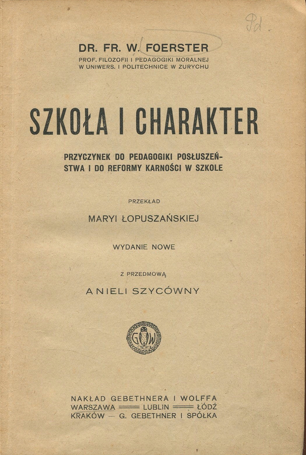 Foerster SZKOŁA I CHARAKTER. PEDAGOGIKA POSŁUSZEŃSTWA KARNOŚĆ W SZKOLE 1919